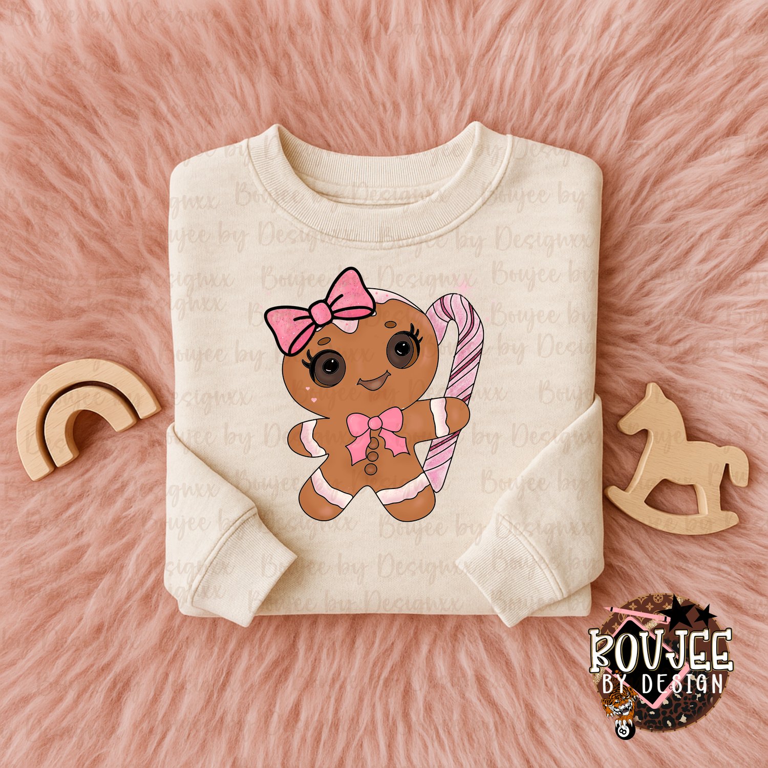 A super sweet hand-drawn gingerbread girl holding a pink candy cane — perfect for sublimation, DTF, DTG, stickers, shirts, and all your festive projects! 💕✨