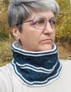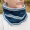 The Snowy Seas Cowl is made to be worn close to the neck. Its size makes it easy to wear over a sweater, winter coat, or over a t-shirt to add stylish warmth. Its unisex design and suggested modifications make it a good cowl for all to wear.