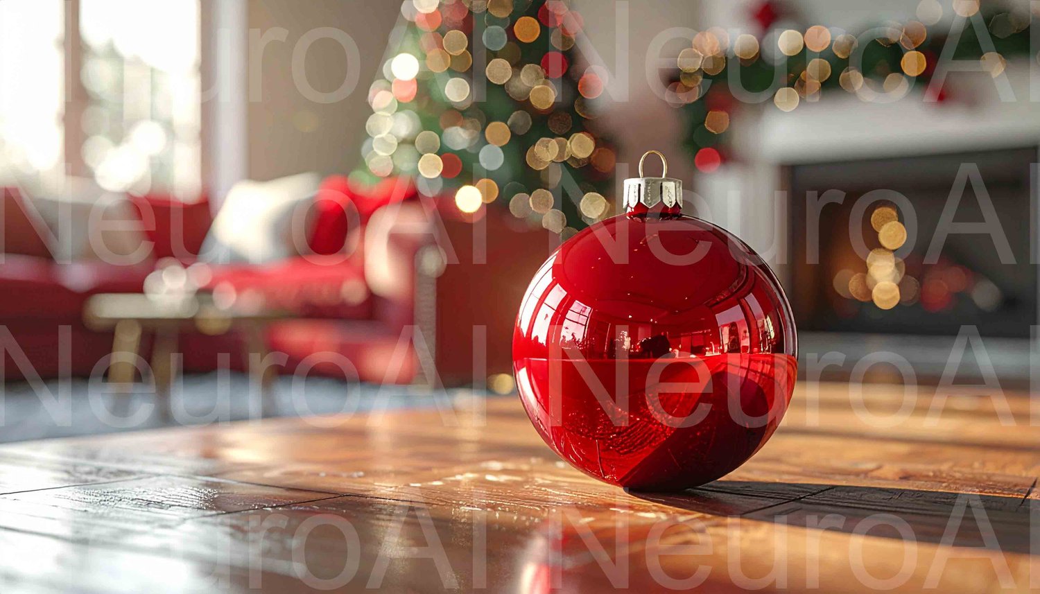 Shiny red ornament on wood table, festive Christmas bokeh background