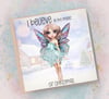 Stunning Christmas fairy doll. She has blonde, brunette or red hair, and blue, brown or green eyes. 9 dolls in total. Also included is a lovely watercolour background with gold splash embellishments and then a snow overlay to top off your design.