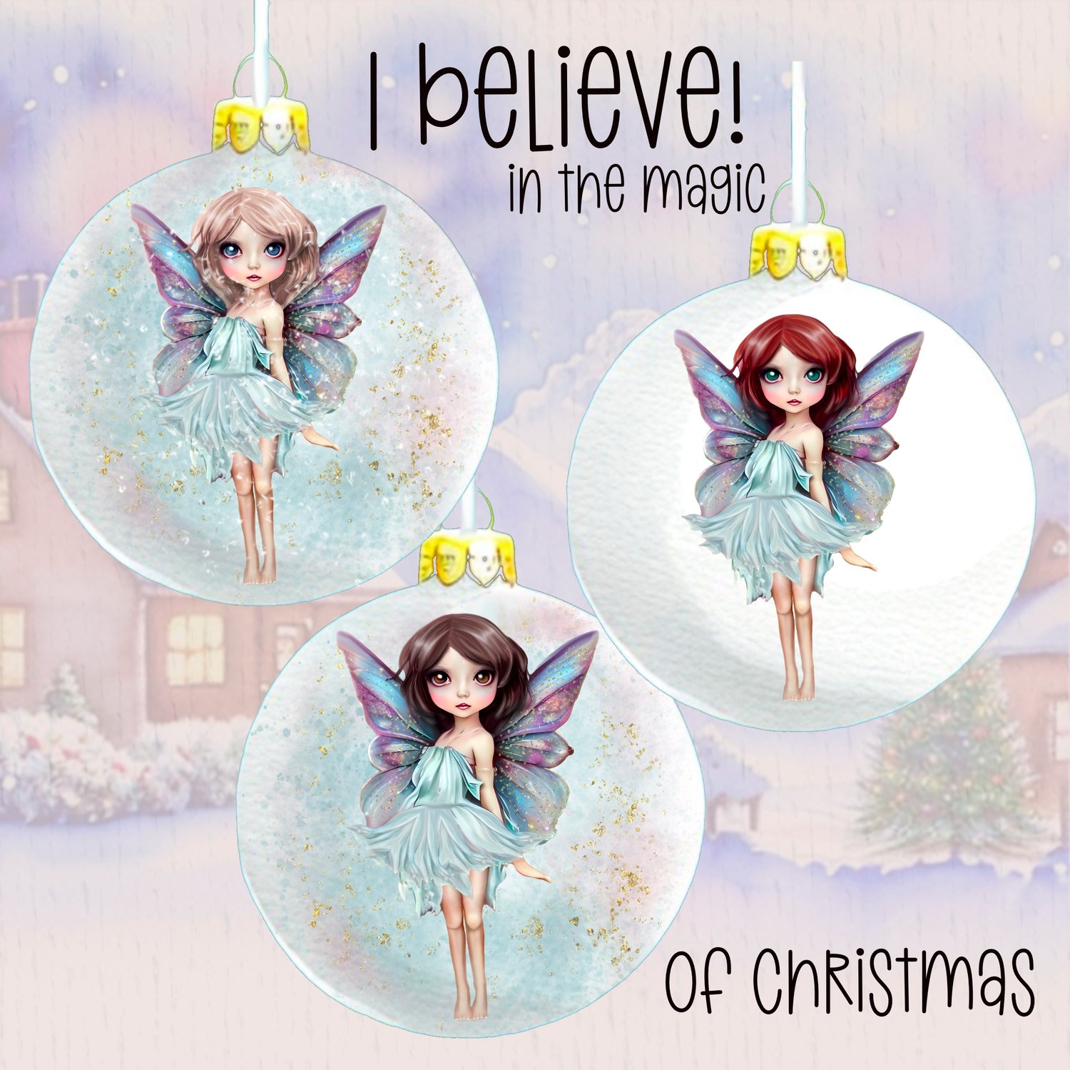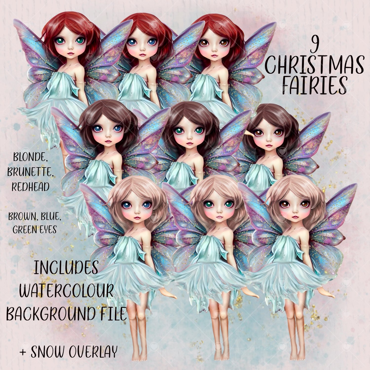 Christmas fairy, with background and snow overlay. 9 fairies.