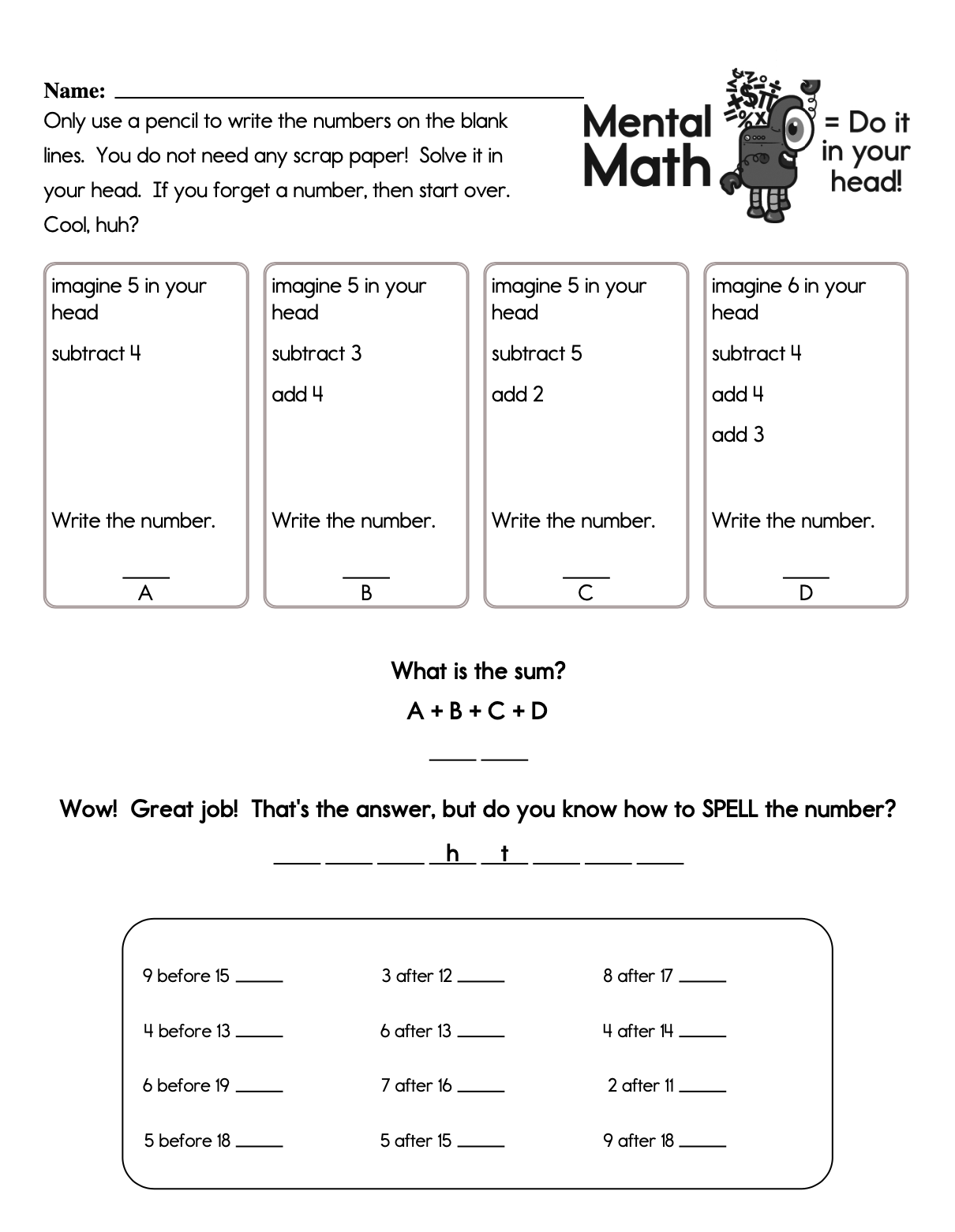 - 2.NBT.B.5 – Fluently add and subtract within 100 using mental strategies.