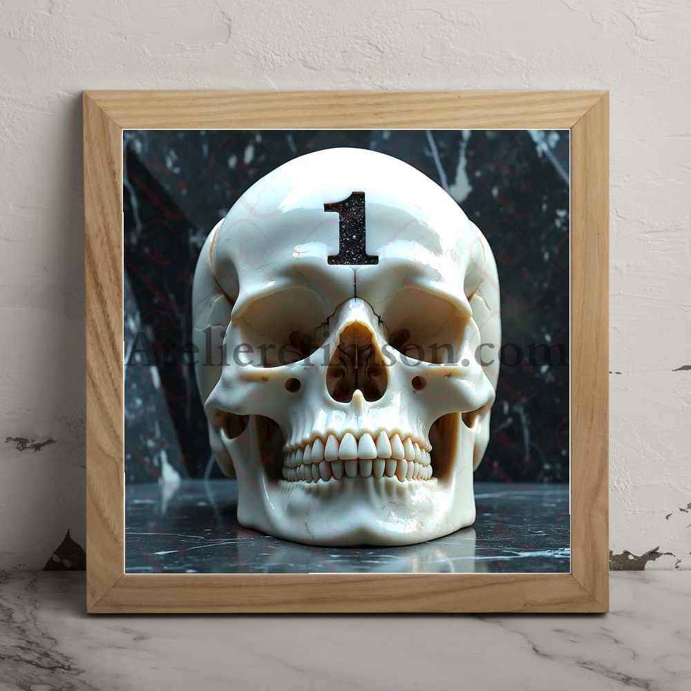Number 1 skull obsidian marble deeply engraved character on the forehead of a white marble skull. The character, filled with dark obsidian, contrasts sharply against the pale skull. Set against a black crystalline background, the skull and character dominate the image.