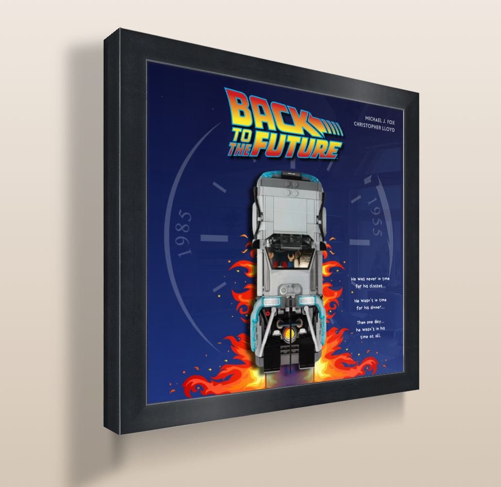 Showcase your LEGO Back to the Future DeLorean (#77256) with this retro-inspired square poster.