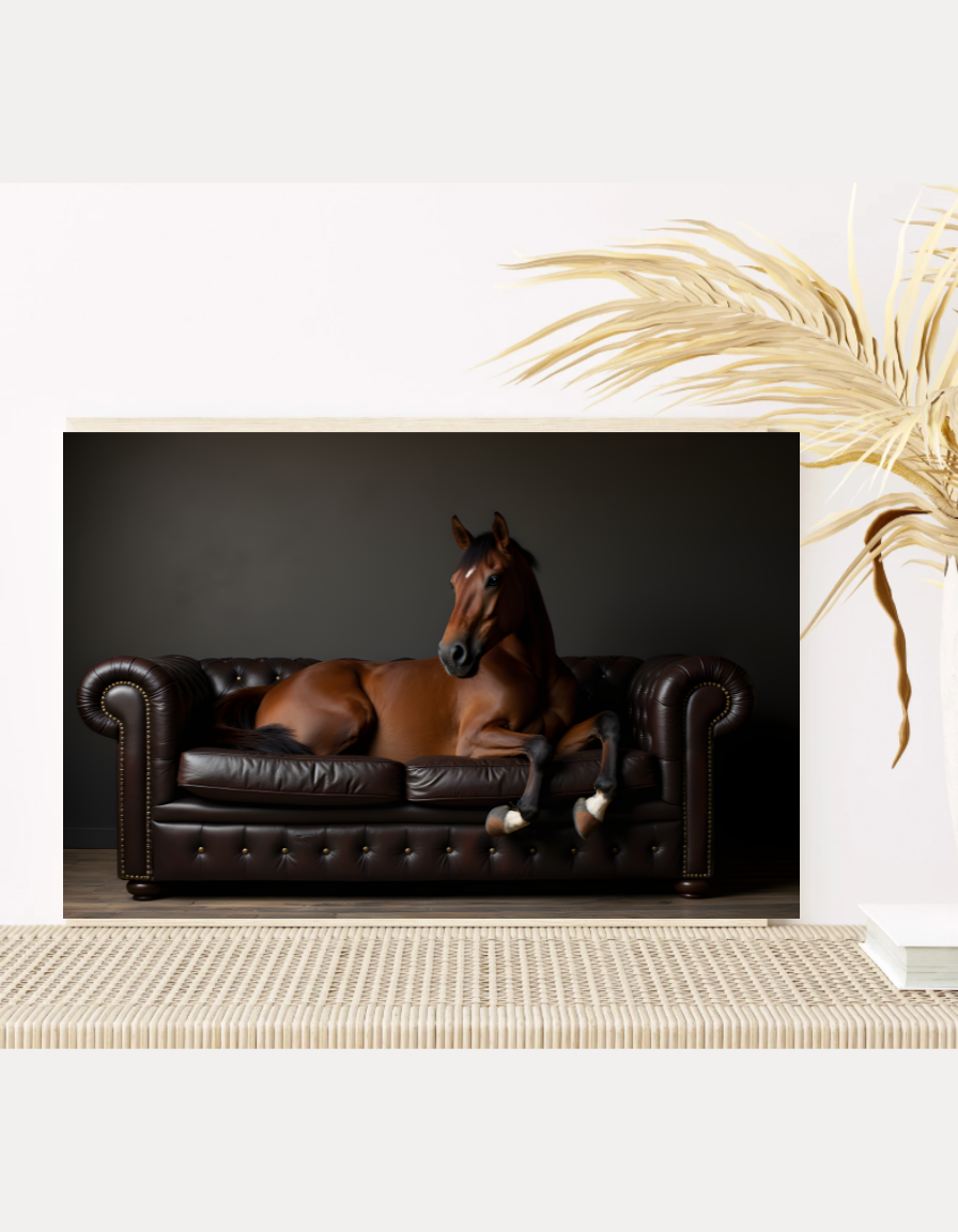 This instant download PNG file allows you to print your own horse wall art at home or through a professional service, making it versatile for framing as wall decor in living rooms, bedrooms, or offices. The surreal animal design blends humor and sophistication, turning any blank wall into a conversation starter with its unique horse on couch pose.