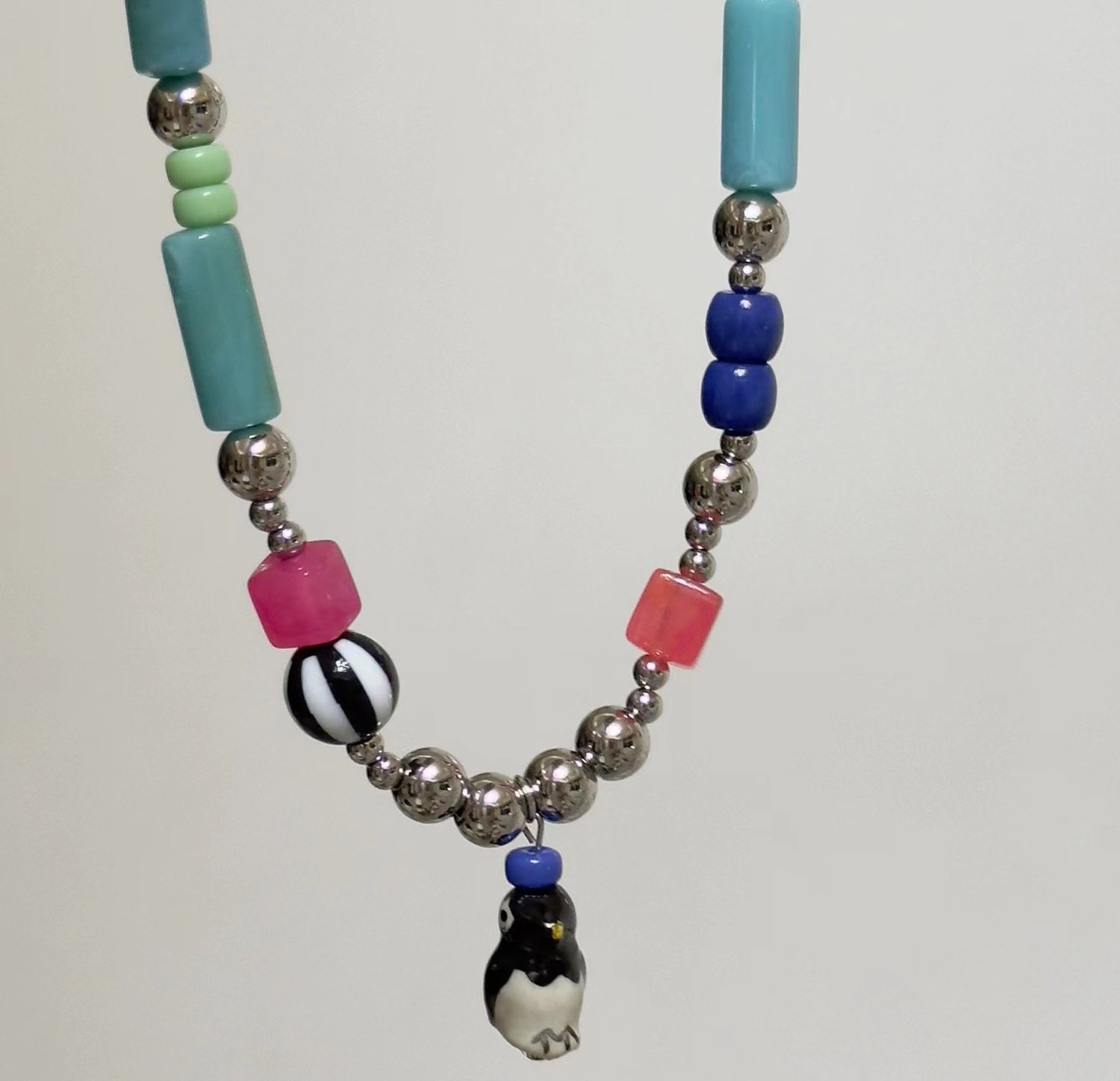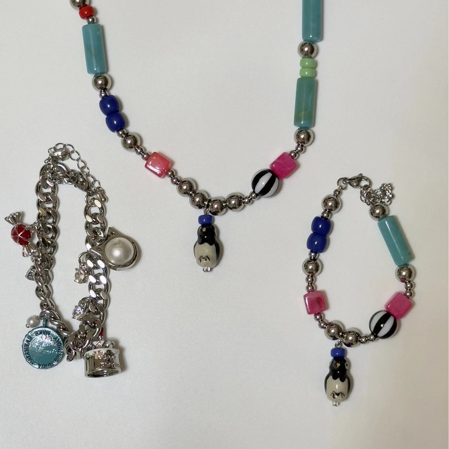 Handmade colorful beaded playful kidcore Y2K stacking bracelet penguin pendant necklace set
