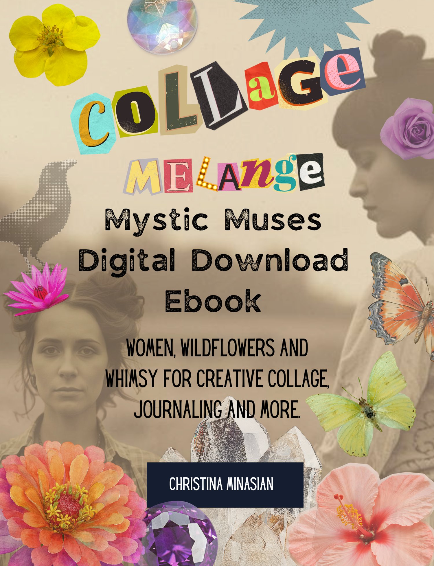 Step into a world of imagination, symbolism, and creative storytelling with Collage Melange Mystic Muses, a carefully curated digital collection of high quality imagery designed for collage artists, mixed media creators, journalers, and anyone who loves feminine, nature inspired art. This downloadable ebook is filled with enchanting images of women, wildflowers, butterflies, gemstones, rocks, and decorative elements that invite layering, transformation, and artistic play.