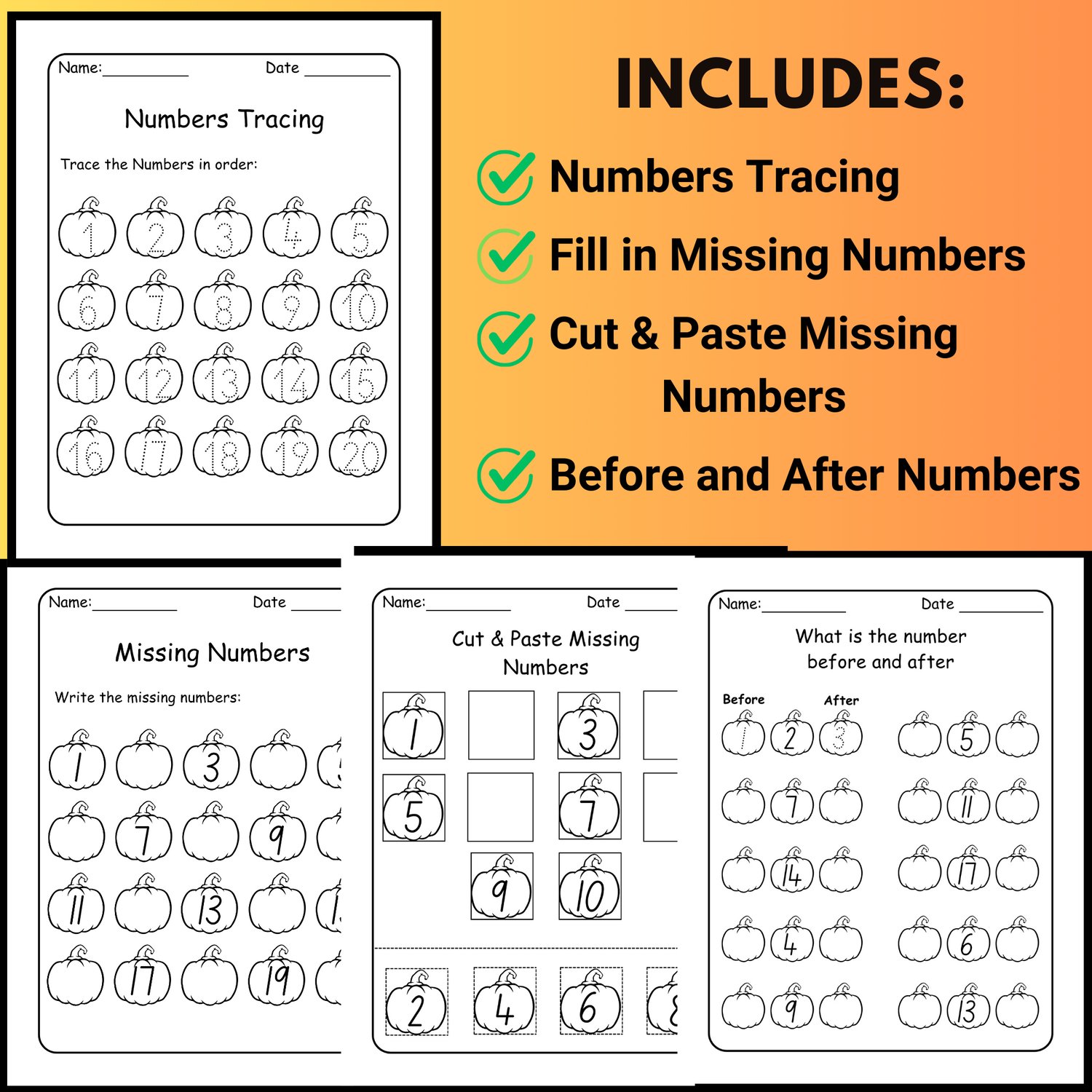 Students will enjoy tracing, filling in missing numbers, cut-and-paste practice, and before-and-after number activities. These worksheets are perfect for centers, morning work, homework, or extra practice at home.