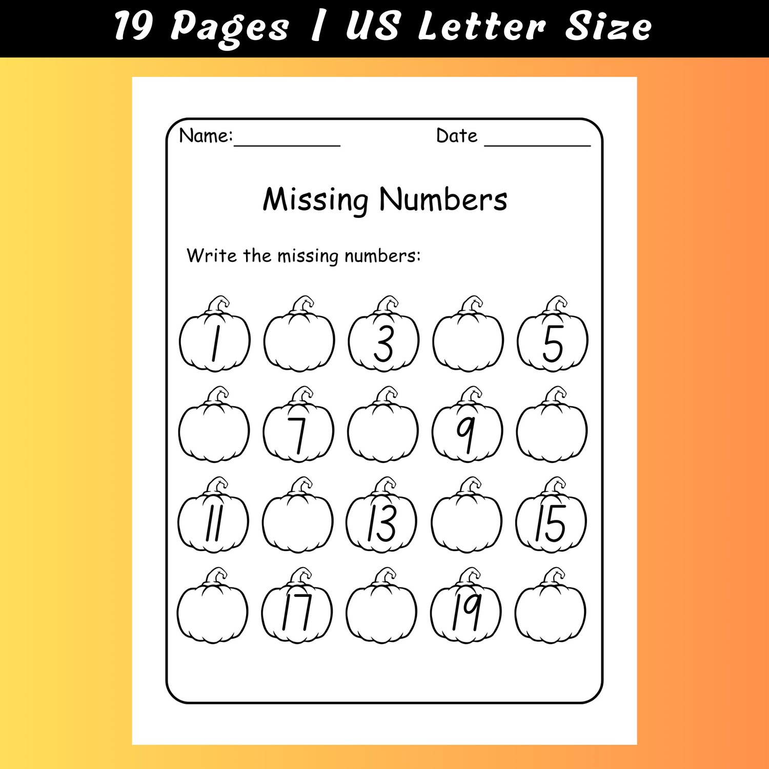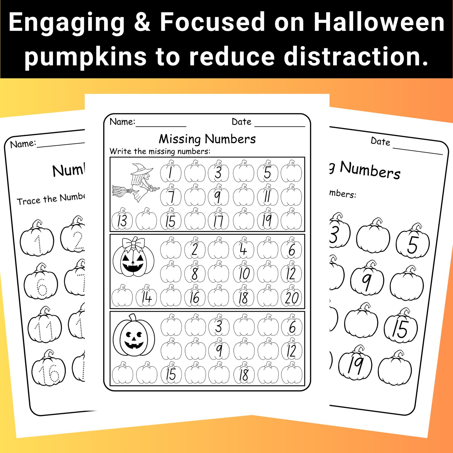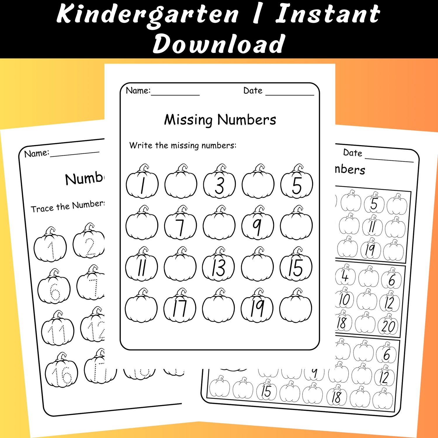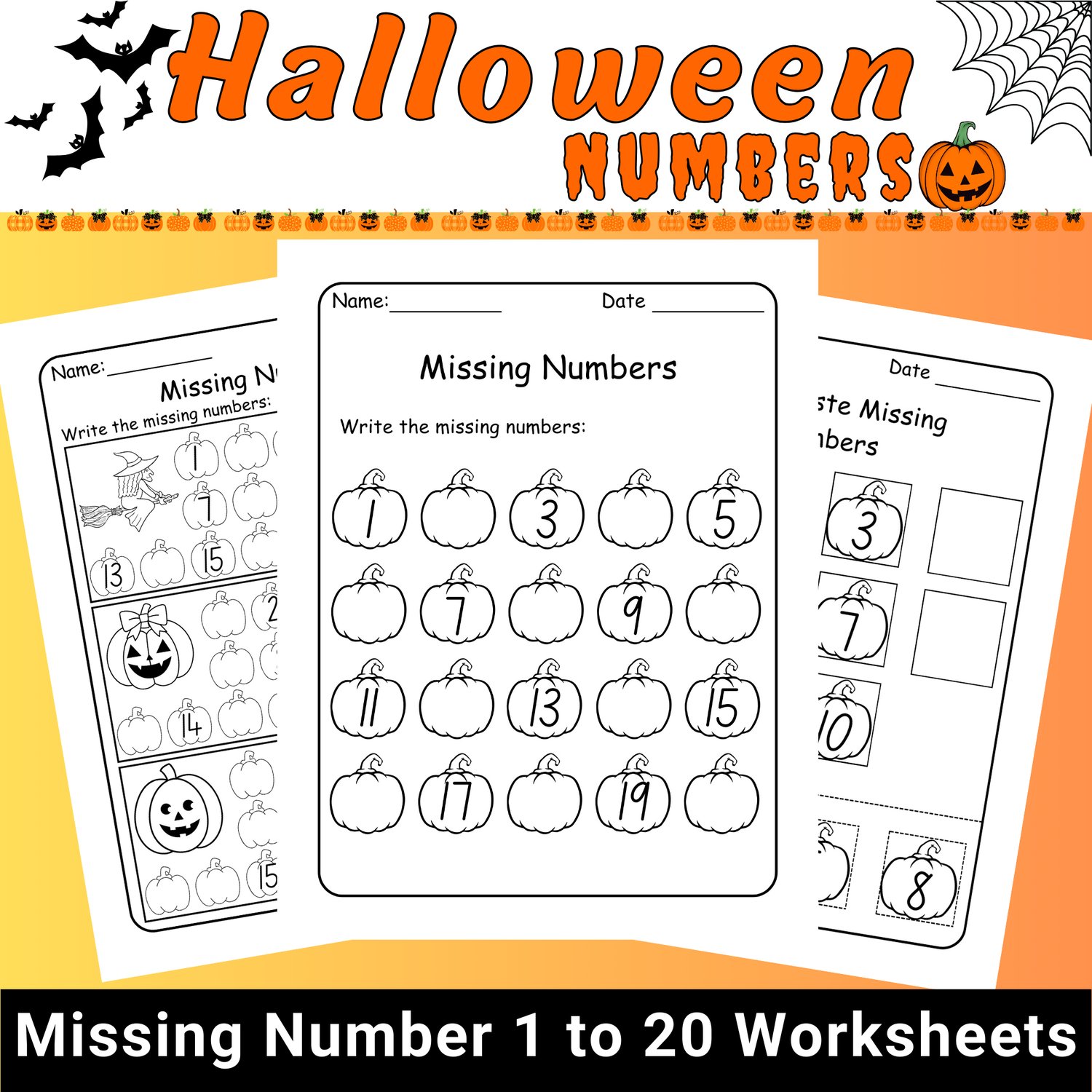 Halloween Pumpkin Missing Numbers 1-20 Worksheets: Kindergarten Math (PDF)