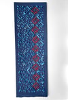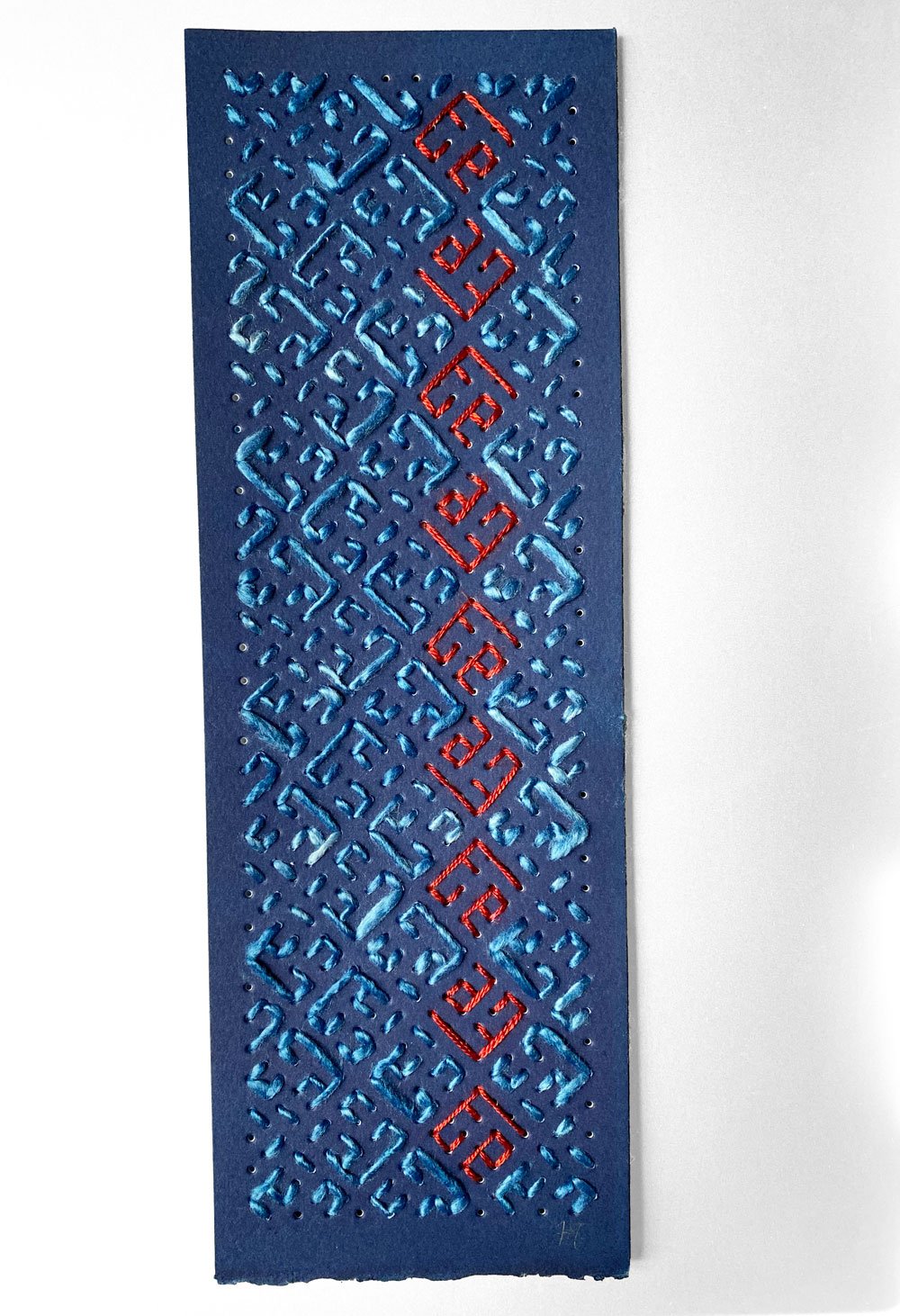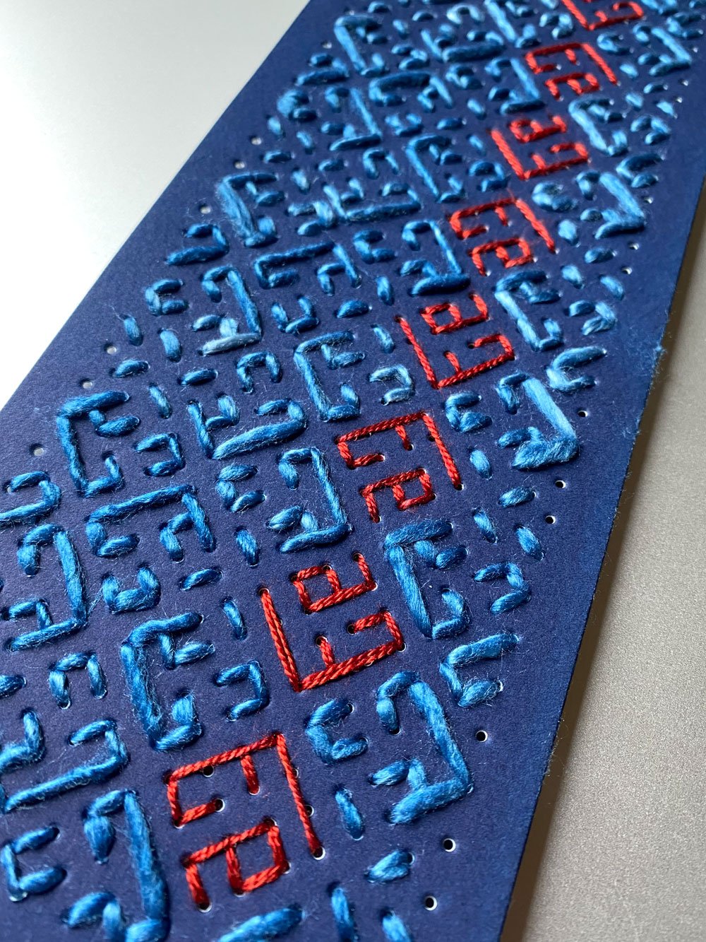 Indigo-dyed combed silk and madder-dyed silk thread, stitched on indigo-dyed paper, 10x28 cm.
