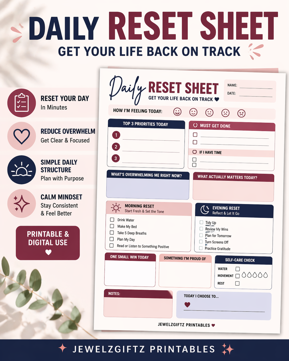 This Daily Reset Sheet is designed to help you pause, refocus, and take back control of your day—without complicated systems.