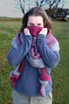 The Lanelands Shawl is inspired by leafy garden vines interlacing themselves through trellis as they climb towards the sun. A mixture of intarsia, short rows, a simple cable and some lace creates an interesting and unusual combination of colour, detail and textural interest. The knots in the fabric at each end, a quirky twist, are intended to intensify the mix of colour and texture as the fabric wraps around itself, not unlike those garden vines wrapping around each other as they grow.