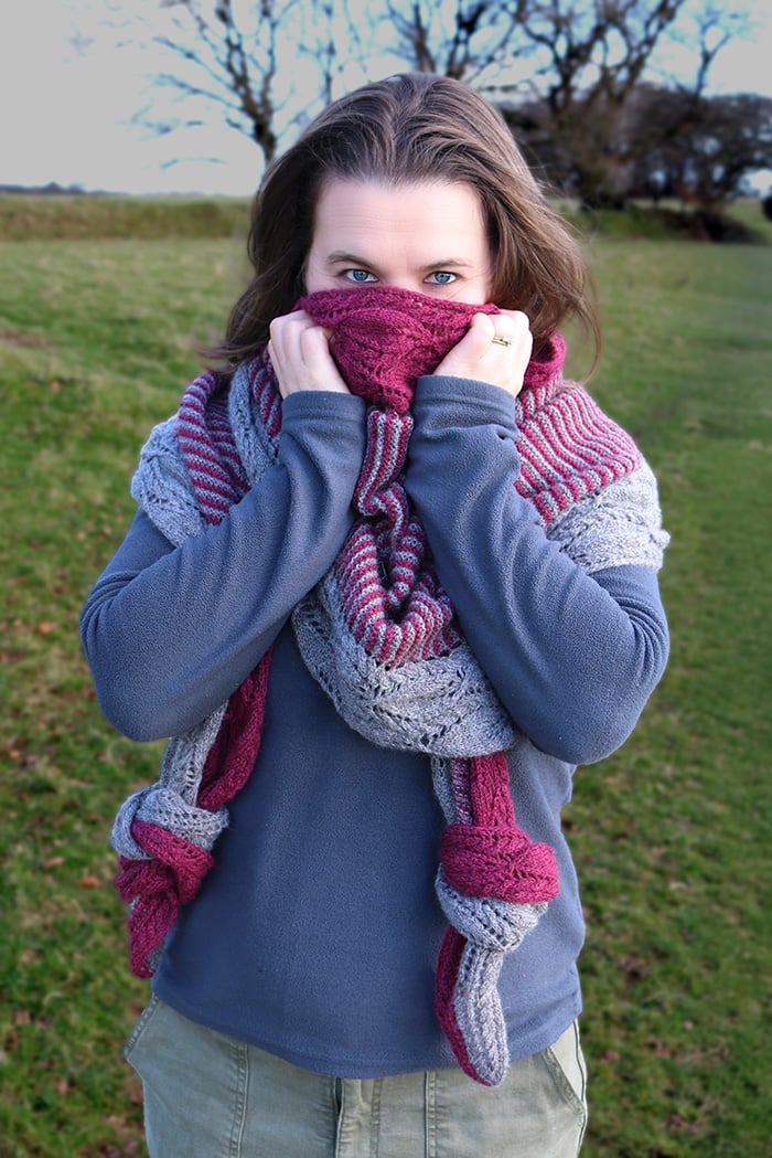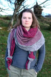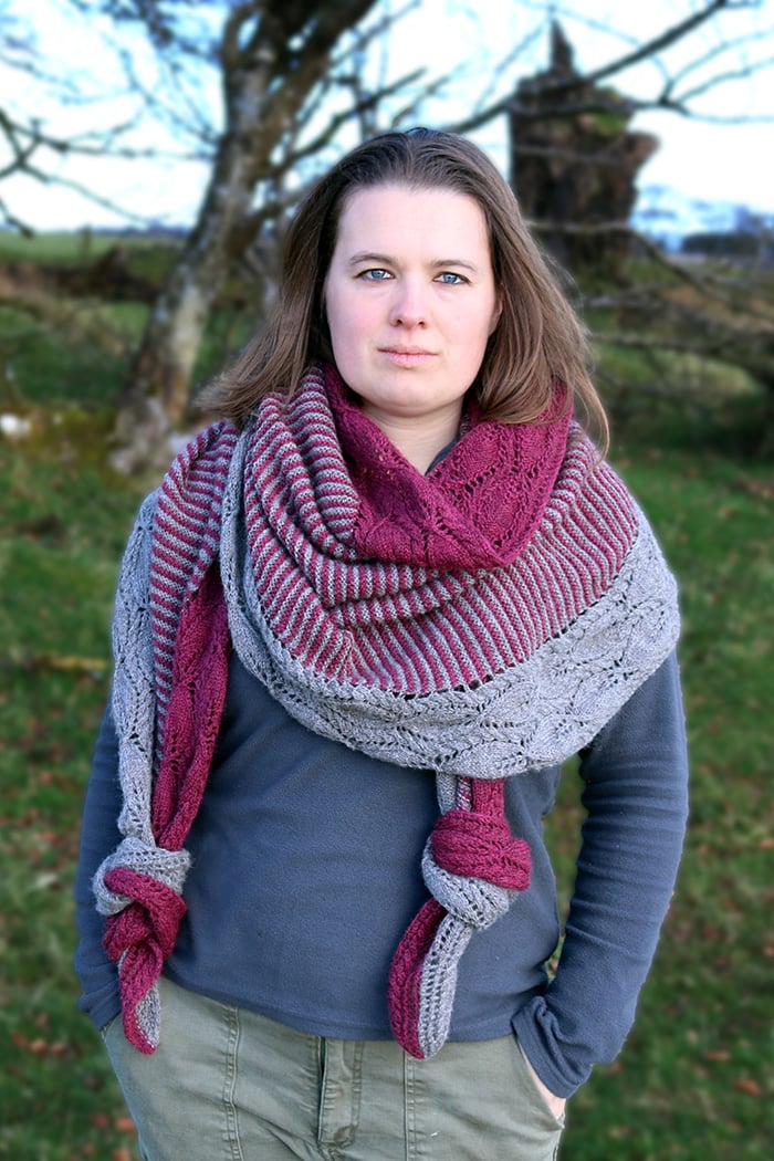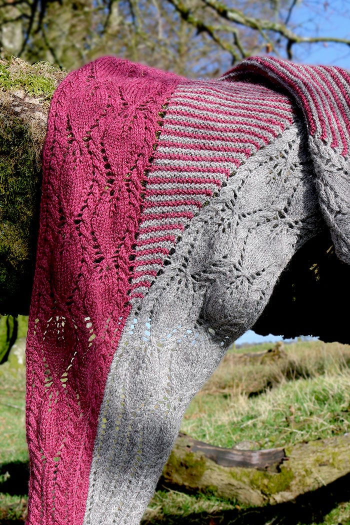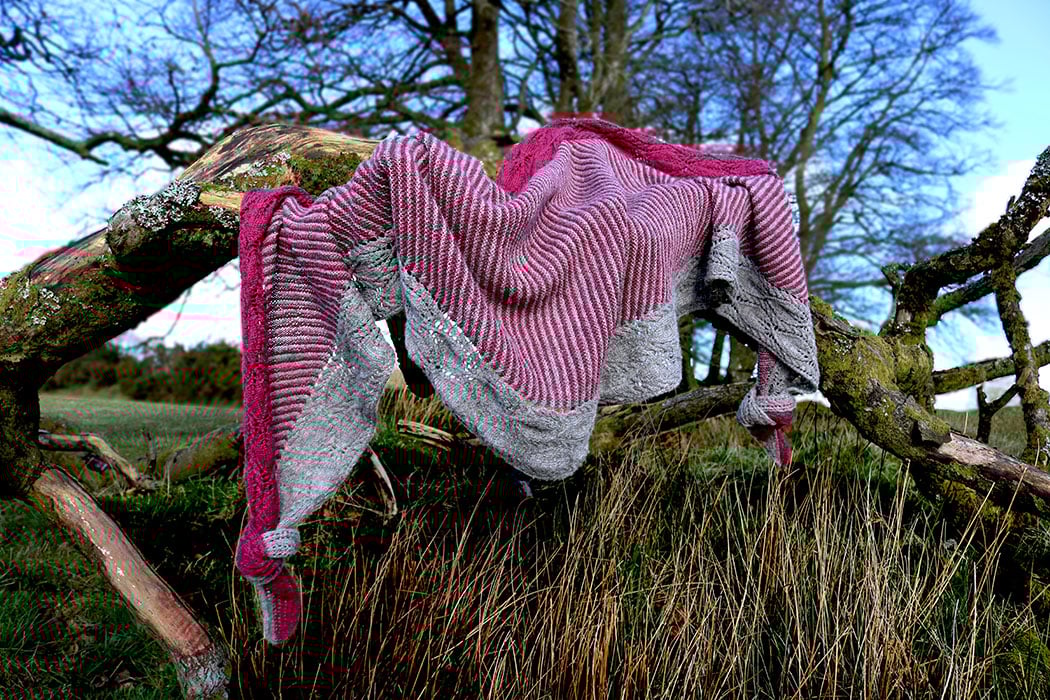 The sample shawl was knit in John Arbon Textiles Harvest Hues 4ply in the colourways ‘Silver Birch’ and ‘Loganberry’. This is a 4ply yarn of 33% Blue Faced Leicester, 33% Falklands Merino and 33% Devon farmed Zwartbles, 400m (437yds) per 100g.