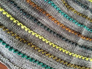 A happy and very fun shawl to knit, just in time for Autumn. It begins at the top and forms a crescent shape, ending with garter st and an i-cord bindoff. Only 1 color yarn is used at a time. Contrast yarn is carried up the side where it blends into the edge of the shawl.