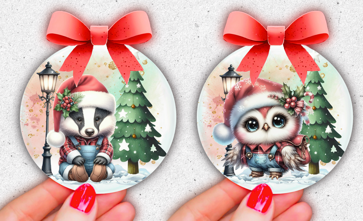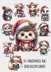 Beautiful Christmas country animals bundle; with and without background. Highland cow, mouse, elephant x 2, hedgehog, reindeer, badger, fox, bunny, mole. Sublimation, print. 20 PNG; 10 designs with no background, and 10 with background including tree and streetlamp. Ideal greetings cards, mugs, baubles etc