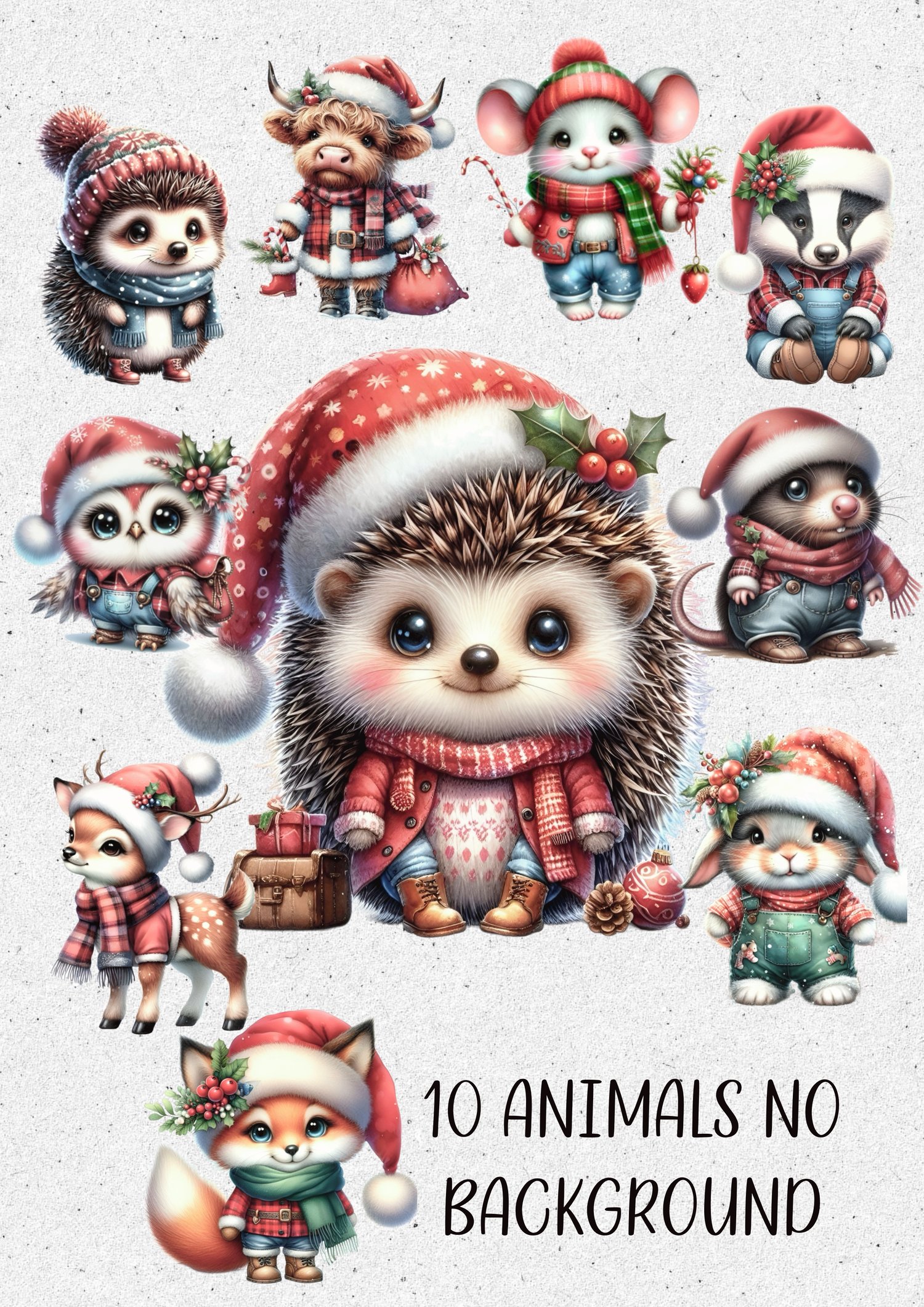 Beautiful Christmas country animals bundle; with and without background. Highland cow, mouse, elephant x 2, hedgehog, reindeer, badger, fox, bunny, mole