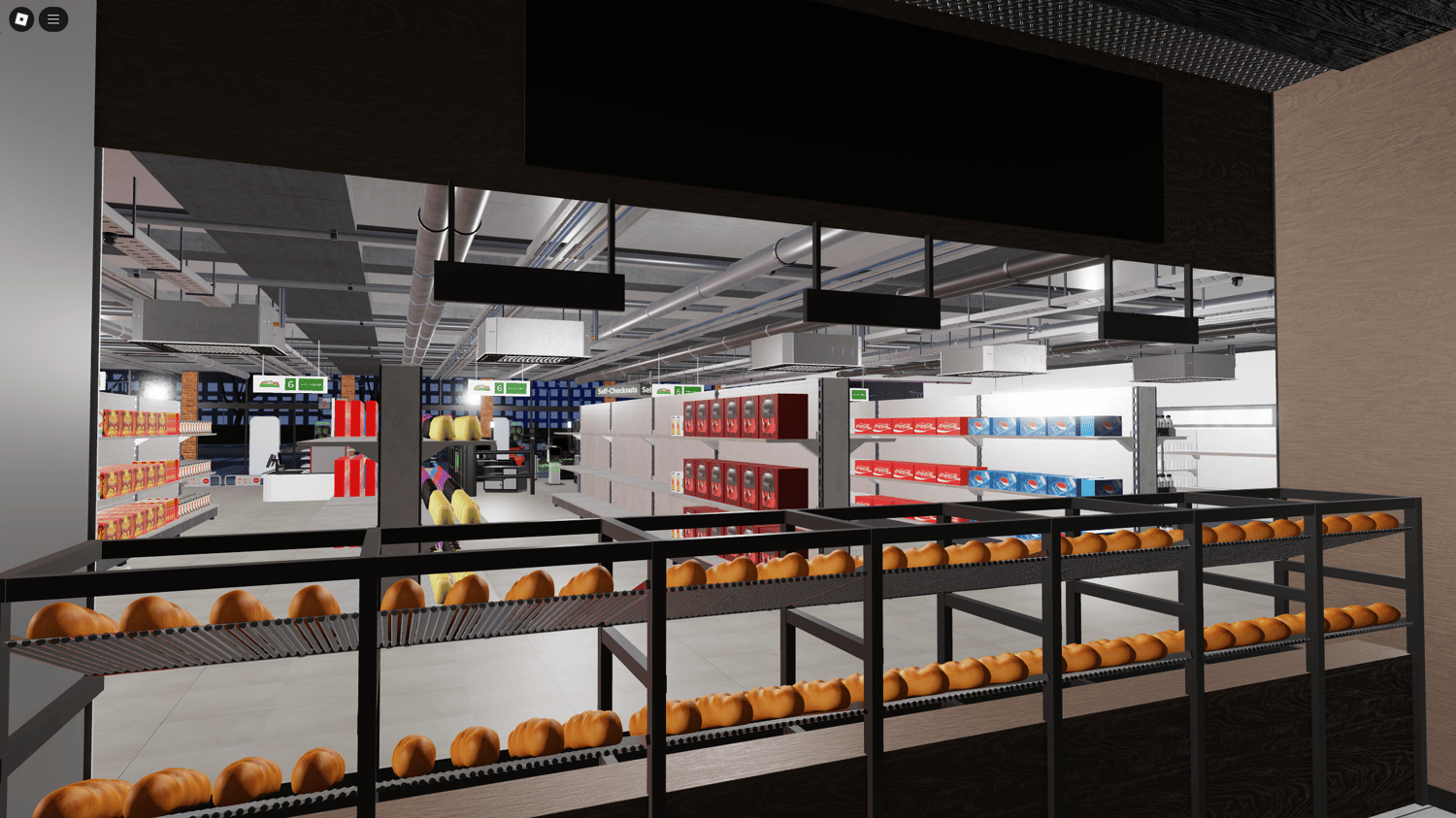 - Working checkout entrances, filler machines, and pickable food props