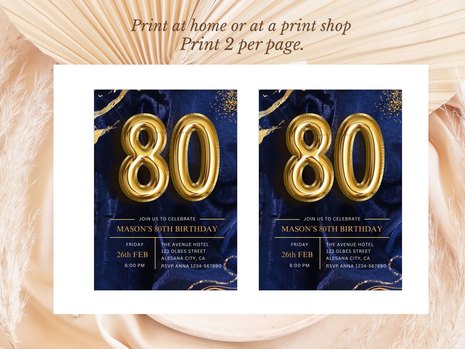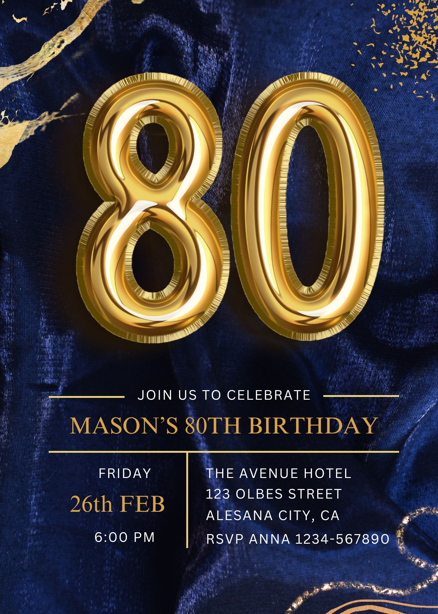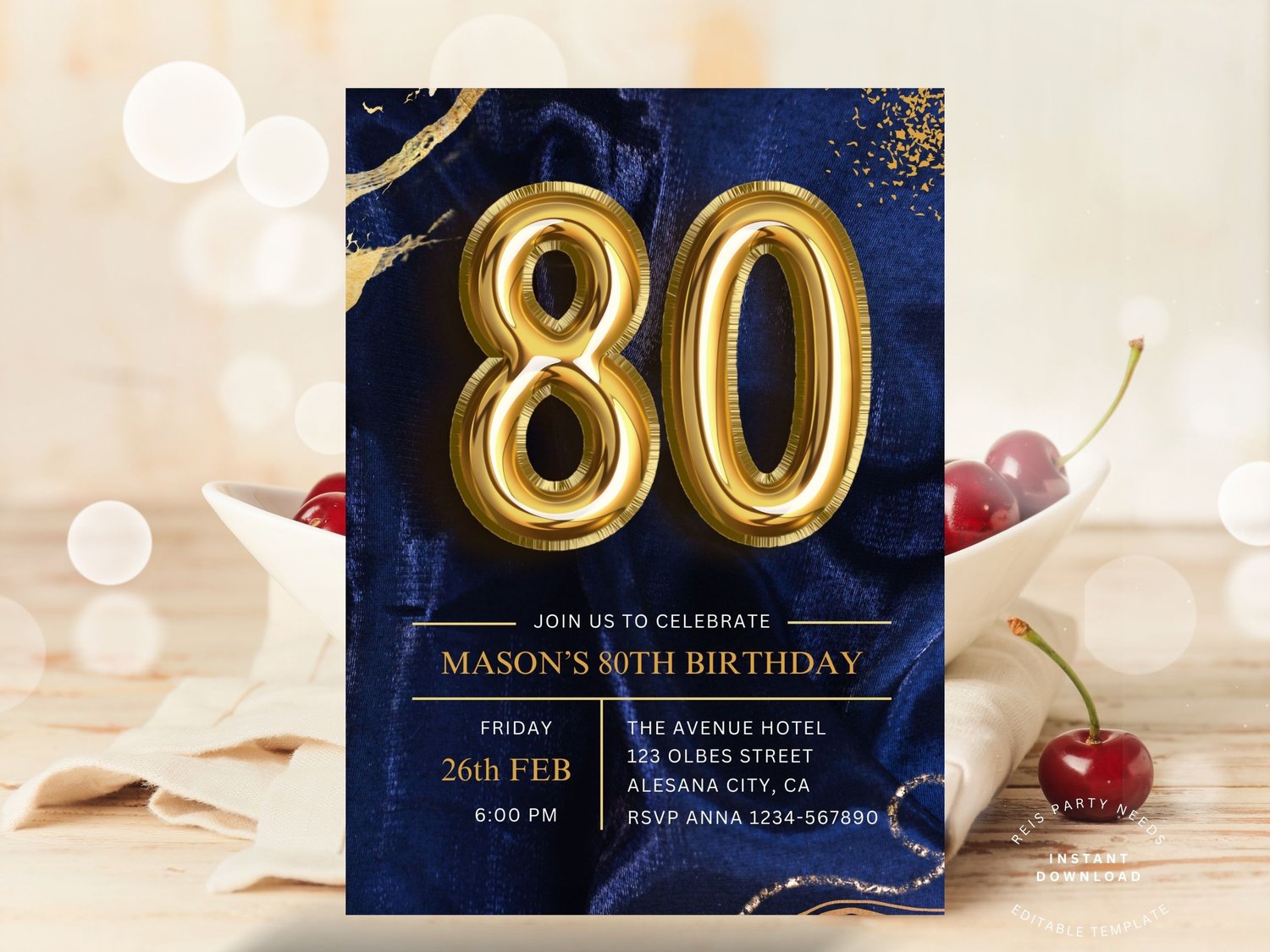 80th Birthday Digital Invitation for Men Navy and Gold Editable, Eighty Text Invite Canva Template, Elegant 80th Birthday Invitation