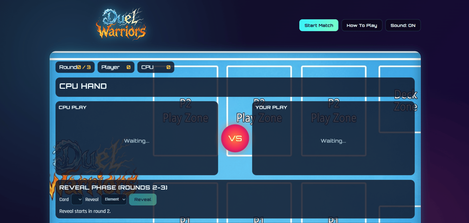 Duel Warriors is a fast-paced strategy card game where you outthink the CPU in a three-round elemental showdown. Play Water, Fire, and Lightning cards with unique power values, use reveal mechanics to bluff or gather information, and exploit the advantage system where Water beats Fire, Fire beats Lightning, and Lightning beats Water. Every clash changes your hand for the next round, so each decision matters as you fight to win the duel.