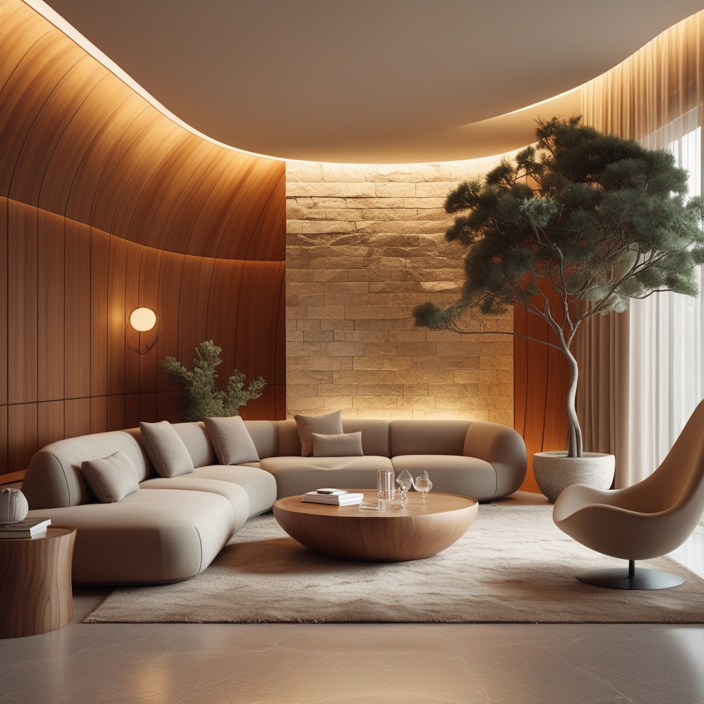 A warm and cozy modern living room in a luxurious style. Include a large neutral-toned sofa with soft cushions, a sculptural accent chair, and a round coffee table in wood and metal finish with minimal decor like books and glassware. Use a soft, textured area rug and incorporate an indoor tree or large plant in the corner. The backdrop should feature curved wood wall panels and warm stone textures, with ambient lighting integrated into the architecture. Add sheer curtains allowing soft daylight to filter through, creating a calming, elegant atmosphere