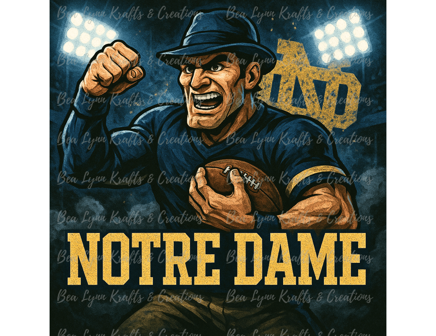 Bring the grit and legacy of Notre Dame to your next project with this super hyped Fighting Irish transparent PNG! This powerhouse design features a fierce, game-ready player bursting with energy under the stadium lights, backed by the iconic ND logo. From the clenched fist to the steely determination, this image delivers classic Notre Dame intensity — perfect for die-hard fans who bleed navy and gold.