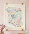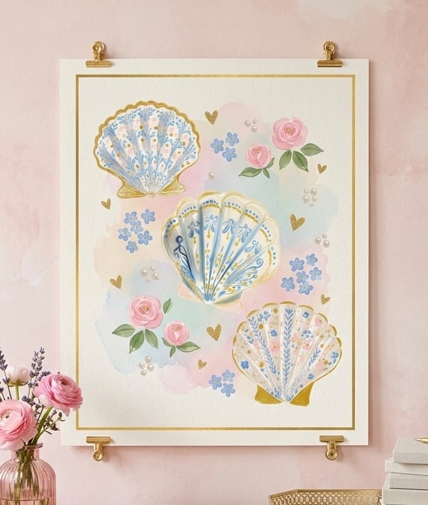 Bring timeless elegance to your space with this coquette coastal shell wall art printable, featuring delicate hand-painted seashells, soft florals, and subtle gold accents.