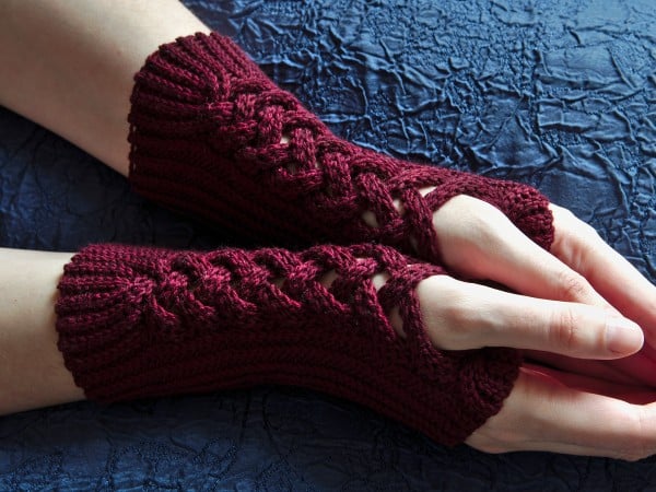These elegantly cabled fingerless mittens are worked entirely in slip stitches, using the back loop only slip stitch. The cable is worked horizontally - a technique that I invented.