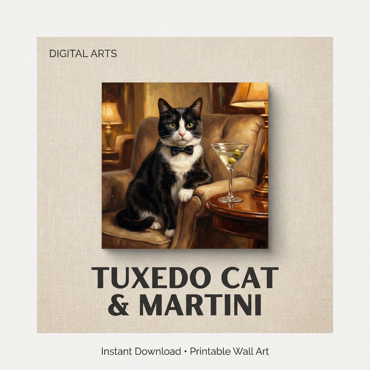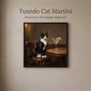 A moody, luxury-inspired oil painting printable featuring a poised tuxedo cat seated beside a classic martini.