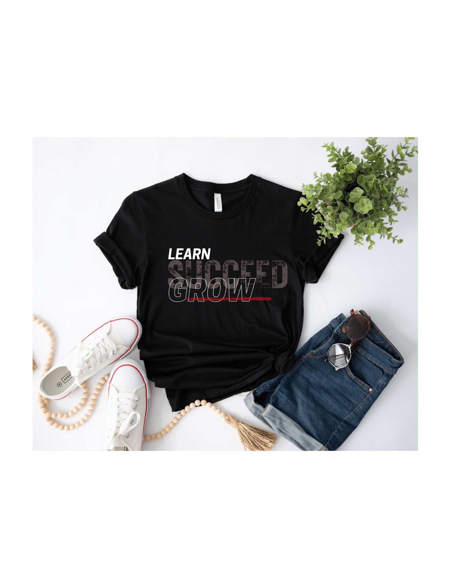 “Learn Grow Succeed Black” Graphic Tee – Make a bold statement with this black short-sleeve crewneck. Crafted from 100% heavyweight preshrunk cotton, this durable tee is designed for comfort, style, and motivation you can wear every day.