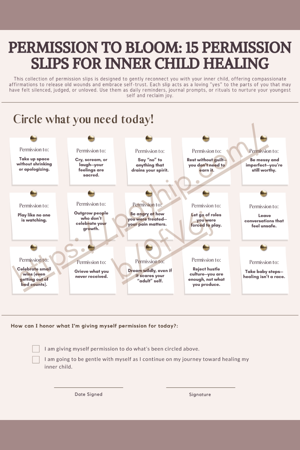 This collection of permission slips is designed to gently reconnect you with your inner child, offering compassionate affirmations to release old wounds and embrace self-trust. Each slip acts as a loving "yes" to the parts of you that may have felt silenced, judged, or unloved. Use them as daily reminders, journal prompts to reflect on, or rituals to nurture your youngest self and reclaim joy.