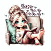 Girl on sofa including darker skin options plus 2 separate text options: “It’s a beautiful day to leave me alone” and “busy doing nothing”. 3 base files with blonde hair; green, blue and brown eyes plus 5 hair clipart and 2 text files. 10 PNGs