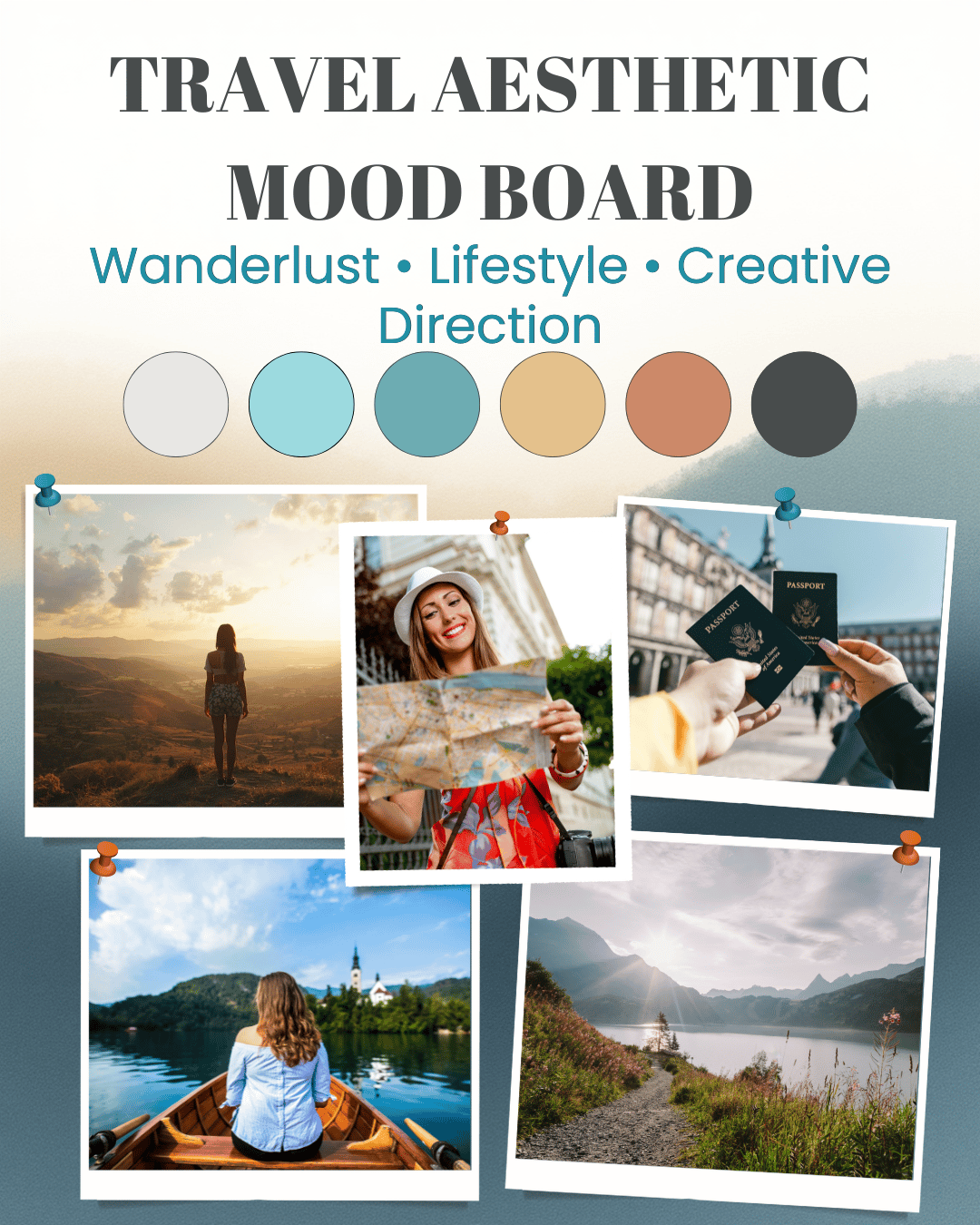 Designed for creators who love wanderlust, adventure visuals, lifestyle storytelling, and dreamy travel inspiration — this mood board helps you curate a cohesive visual direction in minutes.