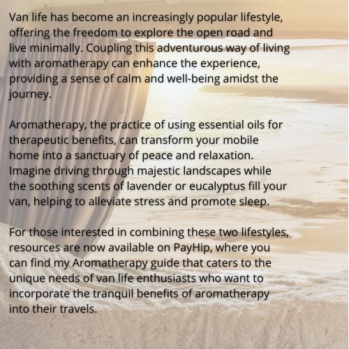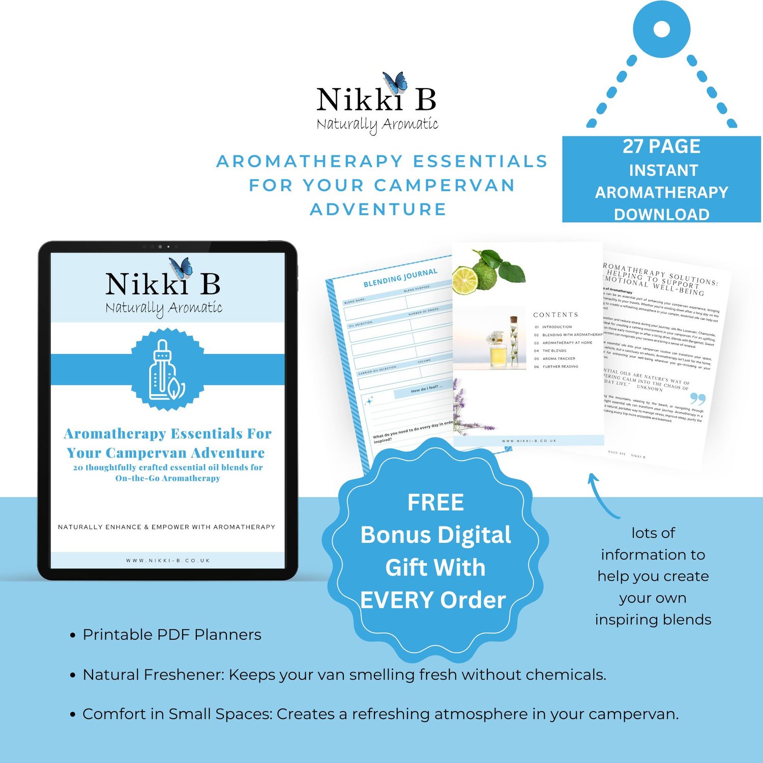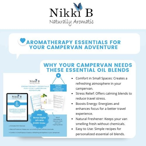 Are you ready to bring a touch of tranquility and freshness to your campervan travels? Our guide, “Aromatherapy Essentials for Your Campervan Adventure,” is just what you need! This 27-page PDF is packed with 20 carefully crafted essential oil blends designed to make your journeys more enjoyable and your campervan a relaxing retreat.
