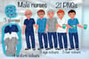 Male nurse, healthcare worker clipart. With coffee. Choice of uniform, hair, eye colour. 4 glasses. Sublimation PNGs. 21 PNGs.