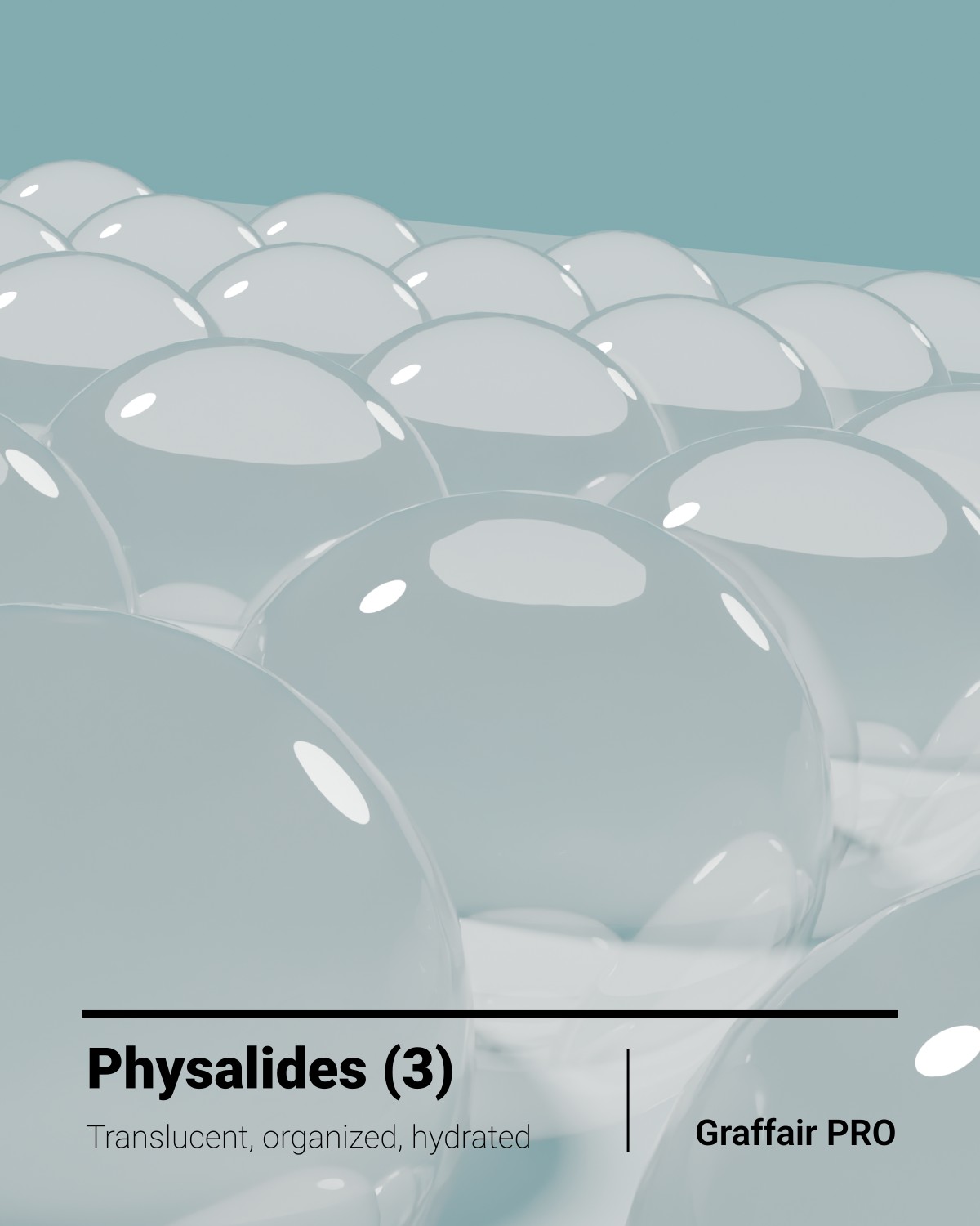 Physalides: Three images of organized perspective, dozens of crystal drops in a sanitized, cool environment. Ideal for biology, cosmetics, medical, and innovative projects.