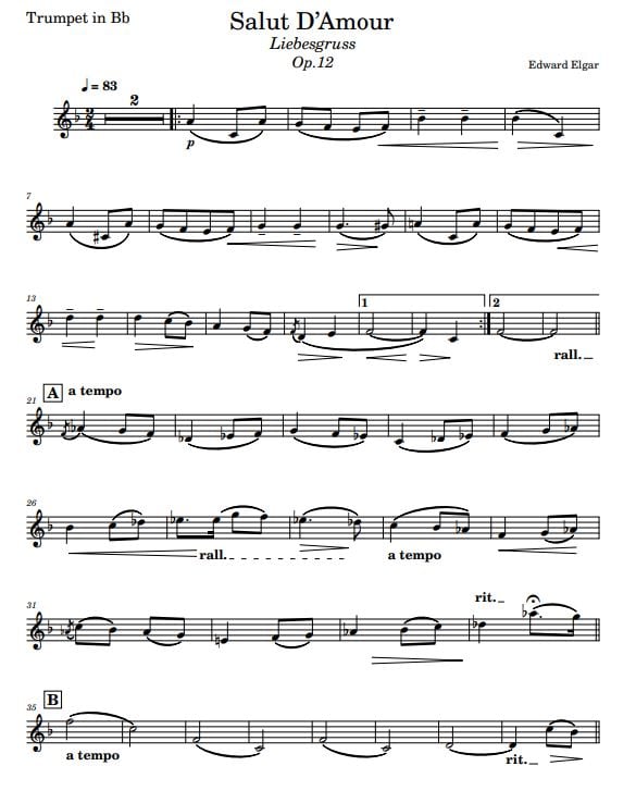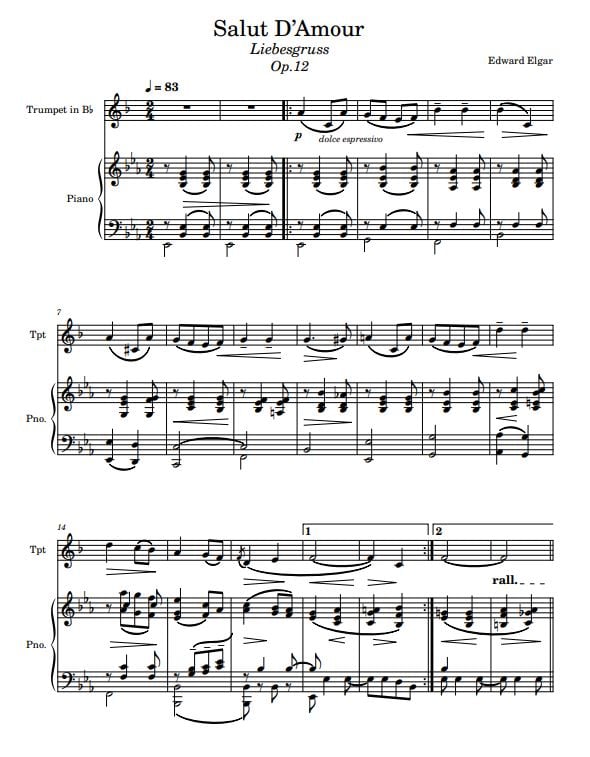 Edward Elgar - Salut D’Amour Op. 12 for Trumpet and Piano in E, Eb and F Major versions (PDF Scores)