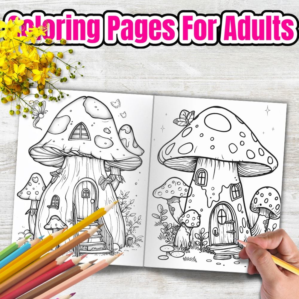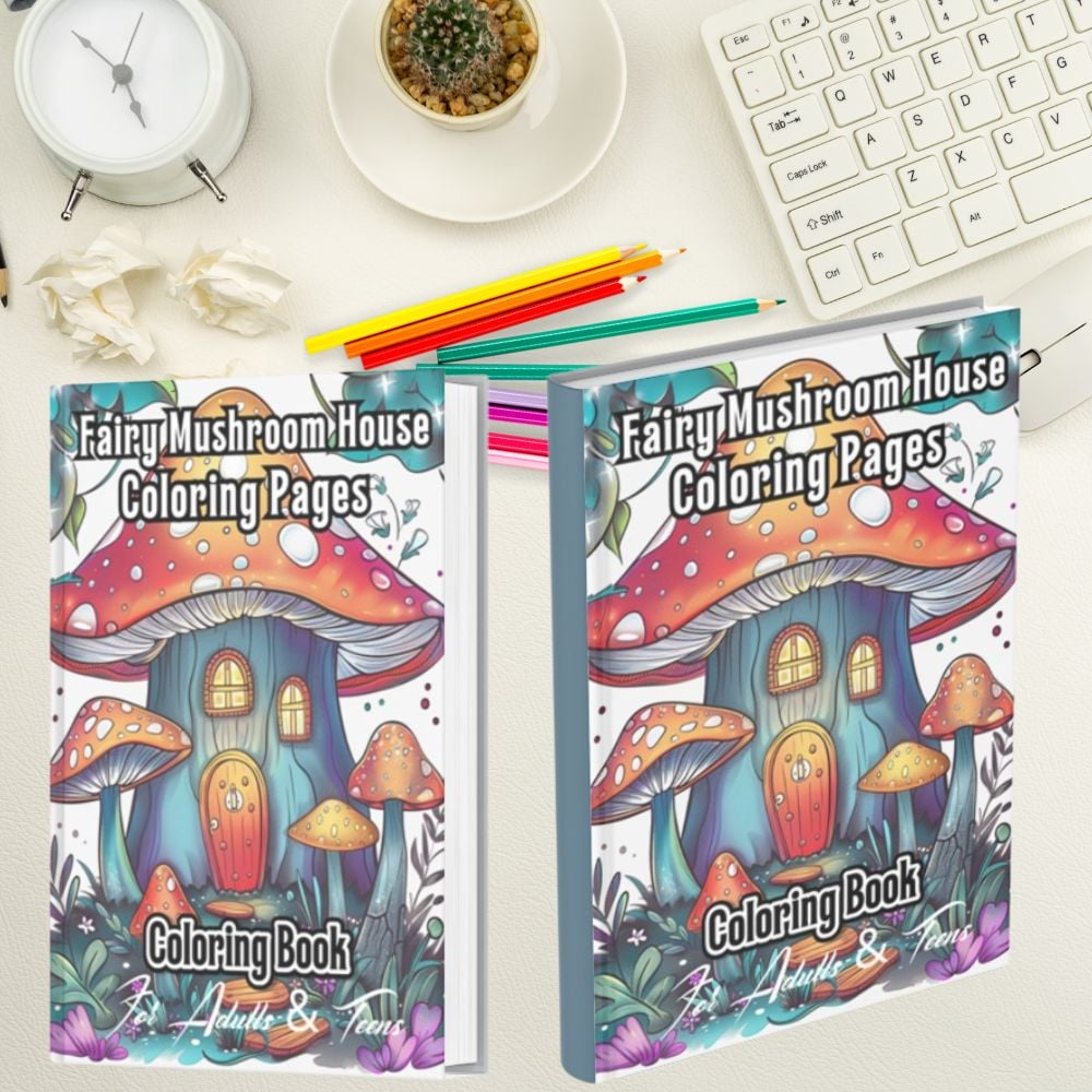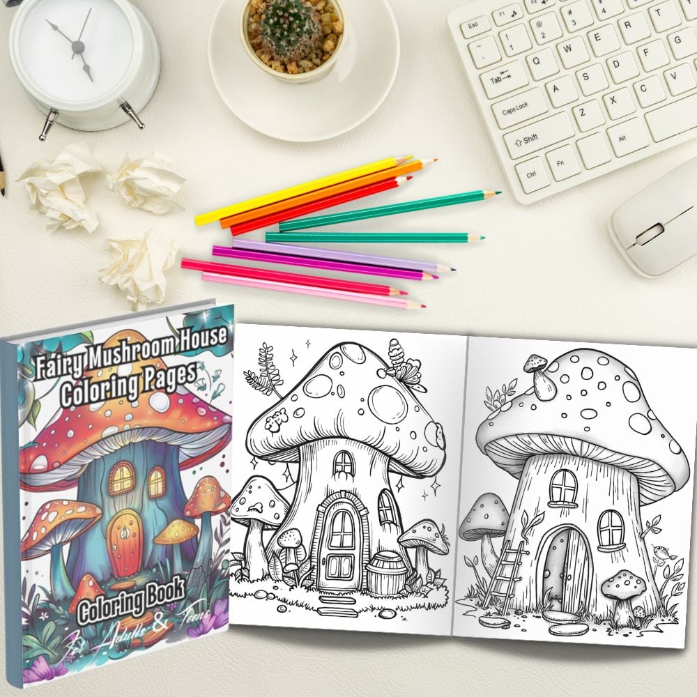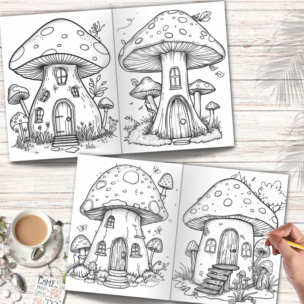Discover the enchanting world of Fairy Mushroom House Coloring Pages! This 100-page grayscale coloring collection invites you to add your creative touch to whimsical, mushroom-shaped fairy houses nestled in magical landscapes. Ideal for all ages, these 8.5 x 11-inch printable pages are ready to download and enjoy right at home, or you can publish them as your own book on Amazon KDP!