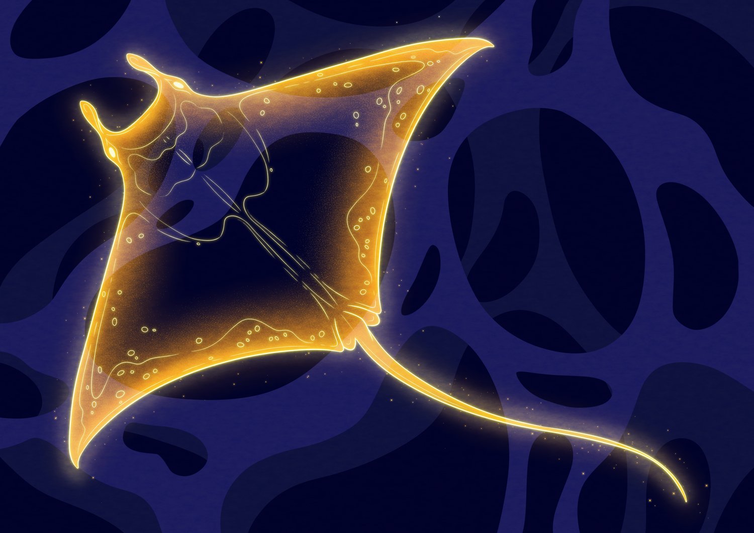 Glow Beneath The Waters reveals the quiet wonder of a glowing manta ray drifting through the deep, dark sea. Its luminous body, almost transparent, becomes a gentle light in the ocean’s nighttime stillness—like a living constellation beneath the waves. This artwork speaks to the mystery and grace of marine life, showing how even in the darkest places, beauty can shine softly and unexpectedly.
