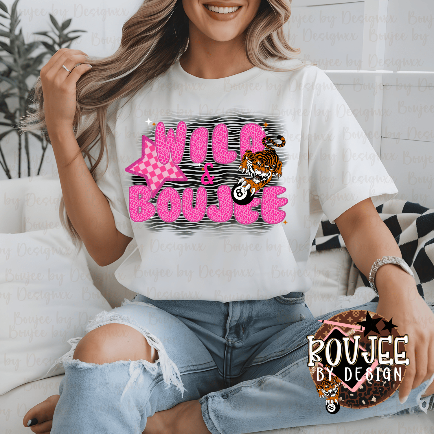 Bring fierce energy to your creations with this bold Wild & Boujee digital design! Featuring hot pink leopard print letters, a patchwork star, a roaring tiger, zebra stripe background, and sparkling accents — this design is perfect for sublimation, DTF, and digital crafting.
