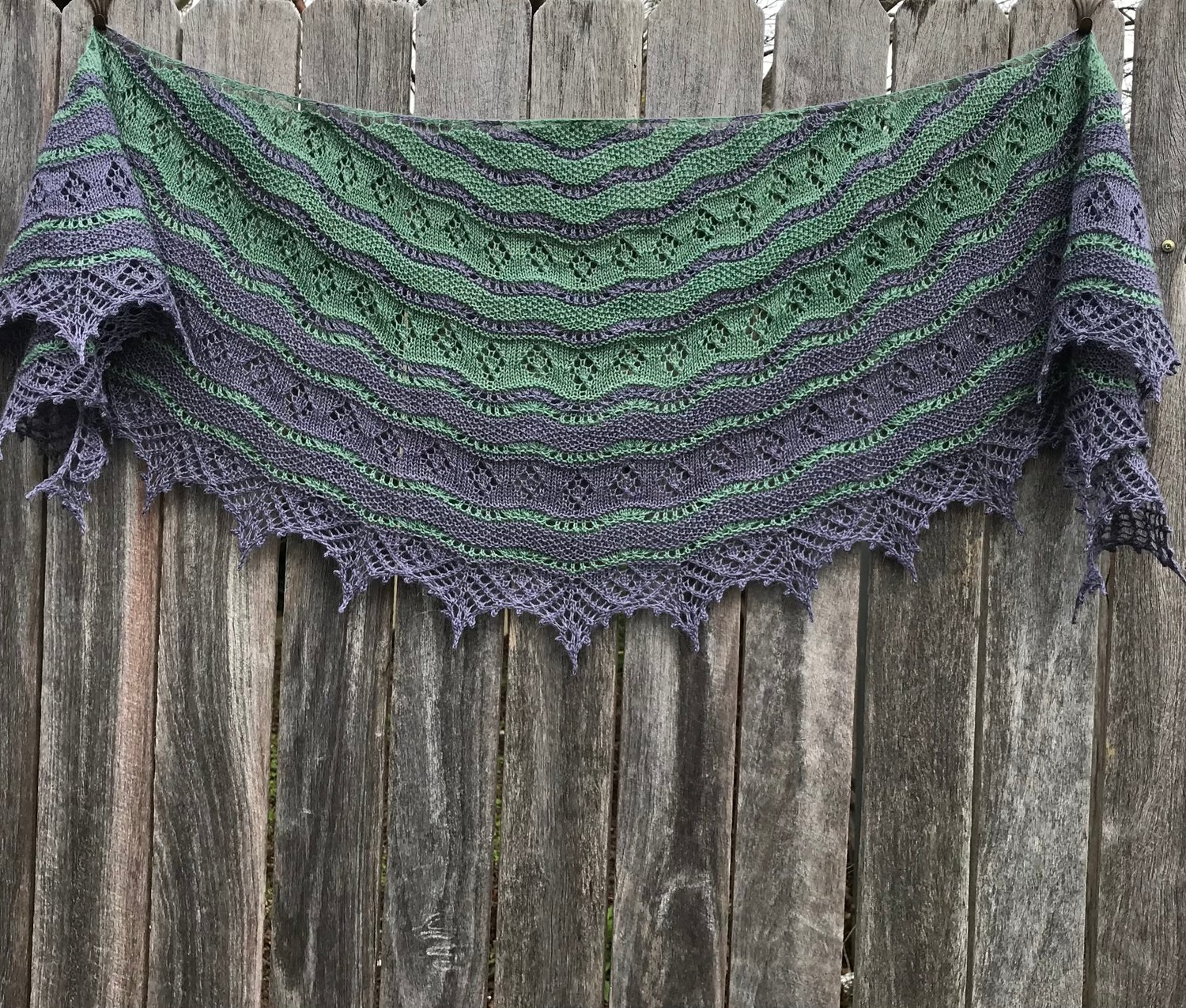 Dancing Diamonds is a fingering (4ply) shawl that features 2 colours of yarn. Each colour takes turns leading through short sections of texture, waves, and diamond lace that will keep you engaged all the way throughout the knit. The waves bring movement to the diamonds and for a dramatic finish, there is a decorative scalloped border to complete the dance.