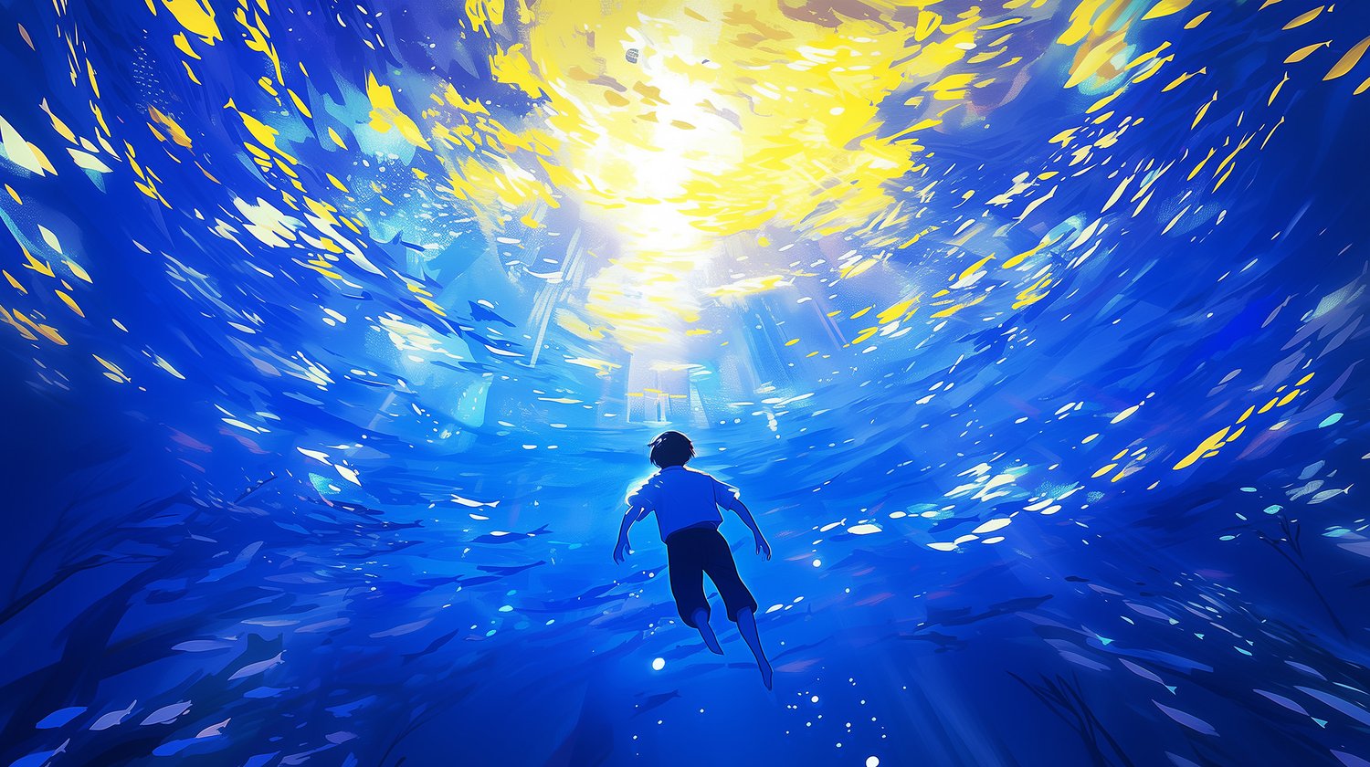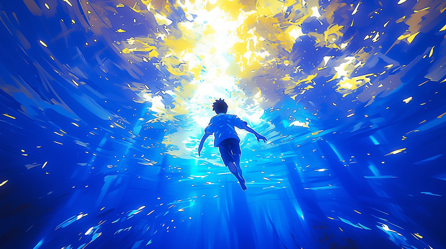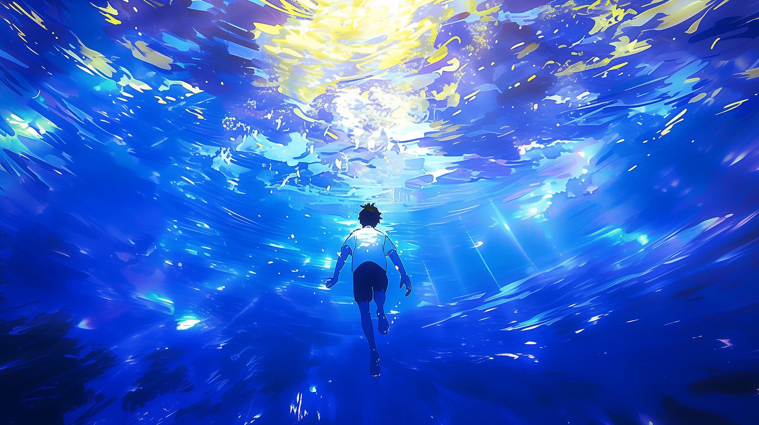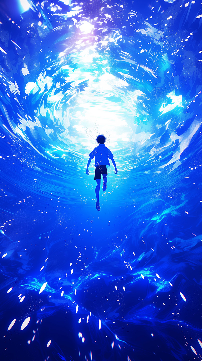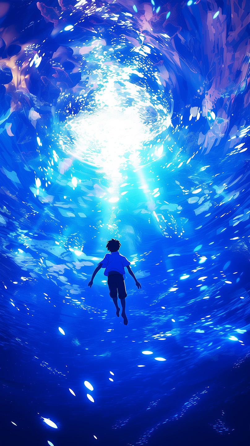 Venture into the depths with "Anime Sea Boy - Into the Abyss." This captivating artwork follows a young anime boy as he descends into a mysterious, dark-blue ocean, surrounded by beams of light that pierce through the water. His expression is one of awe and curiosity, capturing the feeling of exploring the unknown. Perfect for fans of deep-sea and fantasy themes, this image adds a sense of adventure and wonder to any screen or space, inviting you to dive into an enchanting, unexplored world.