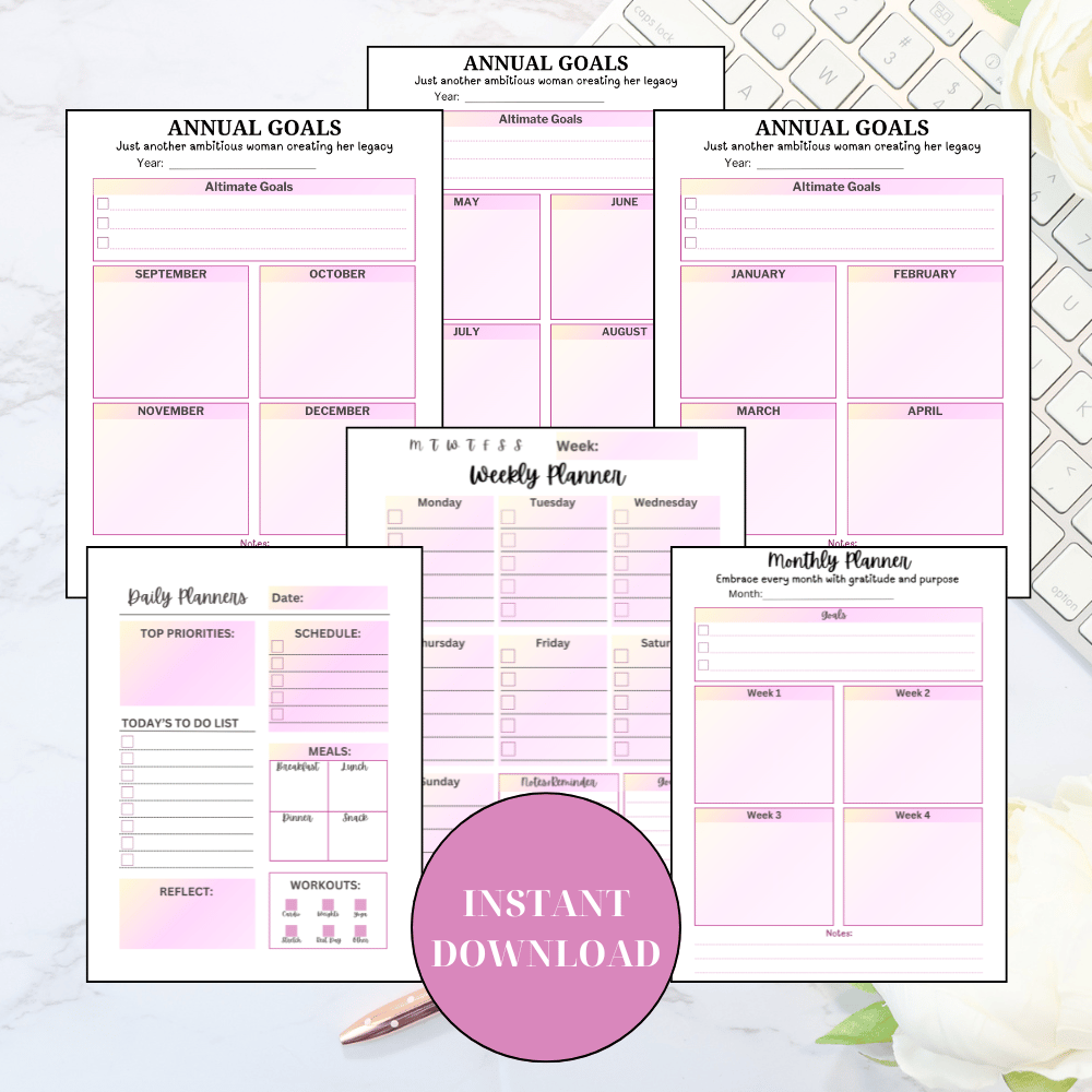 This comprehensive printable planner bundle includes everything you need to plan your days, weeks, months, and year. Designed to boost your productivity and keep you focused, this set features daily, weekly, monthly, and annual planners with sections for goals, priorities, habit tracking, to-do lists, and more. Achieve your objectives and maintain a balanced lifestyle with these beautifully designed planners.
