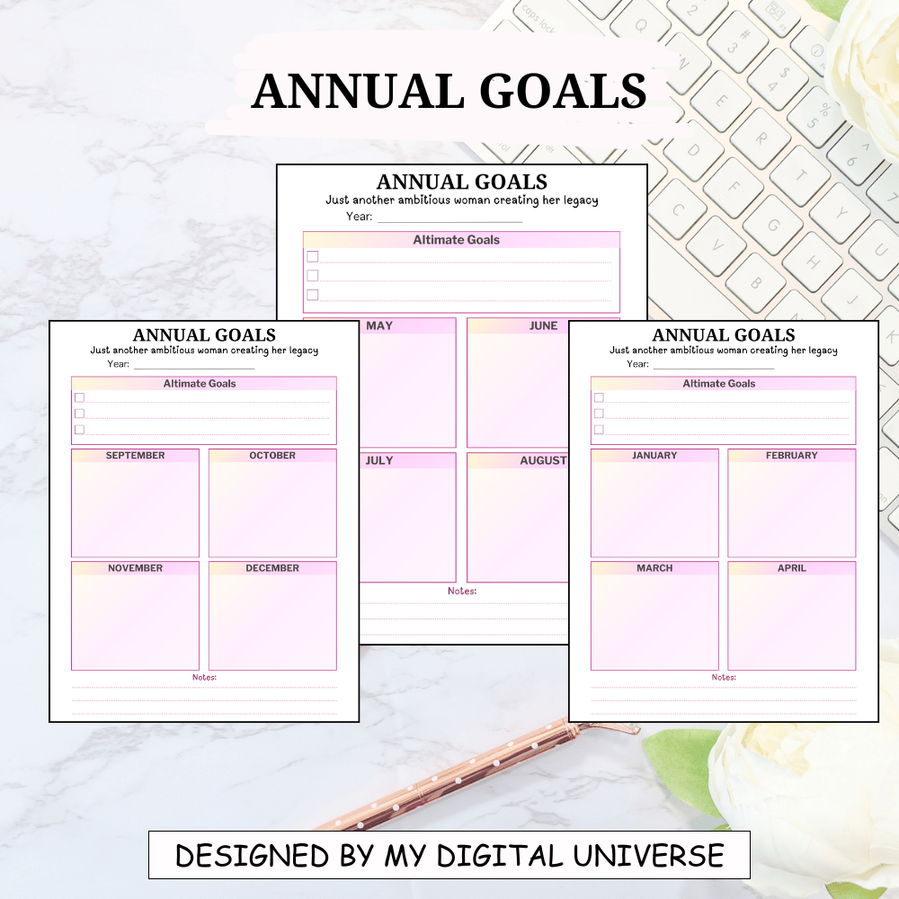- Annual Goals Planner: Set your ultimate goals for the year and break them down into monthly tasks. Includes 3 sheets covering: