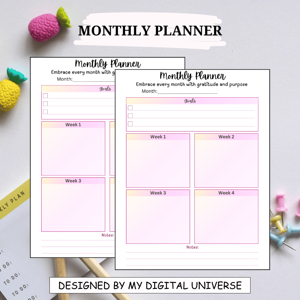 - Monthly Planner: Break down your monthly goals, track progress, and manage your schedule.