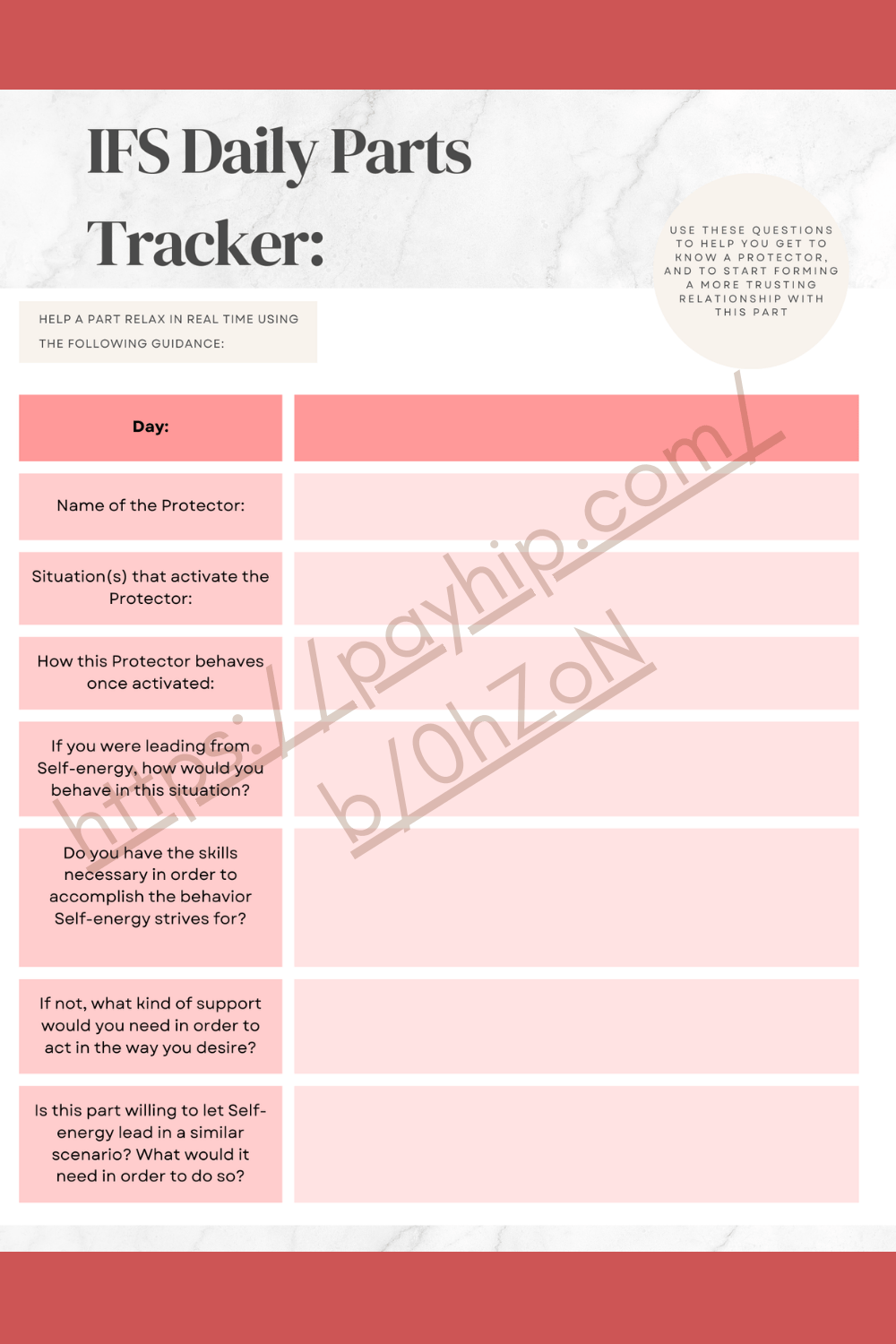 Use this IFS daily parts tracker to help build a Self-to-part trusting relationship. Get to know this part, how it shows up, and identify what Self-led behavior may look like in a similar situation. If you're currently engaged in IFS therapy, this can be useful to keep track of the parts that come up each session.