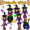 This pack has a green potion, pink potion, purple potion, witch top, witch on broom, witch stirring pot, witch holding a potion, witch with a broom, and a cauldron.