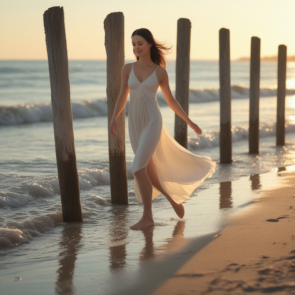 Artistic portrait photography of a serene woman with delicate facial features and a gentle smile, her skin a warm golden brown from the sun, walking gracefully along a single row of weathered wooden poles planted in the sand at the edge of the beach, with each step flowing with calm precision, her balance effortless and sure, her long, dark hair blowing softly in the breeze. The shallow water from a fading wave glimmers beneath her, mirroring her movement in soft, rippling reflections, as the warm light of the setting sun casts a golden glow on the scene, with the woman's slender figure and flowing white dress standing out against the muted tones of the beach and the poles, and the horizon stretching out to meet the sky at a gentle curve.