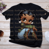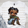 Black Betty Boop wearing camouflage/army fatigue jacket, high heels, blue jeans on a black or white tshirt up to size 3XL
