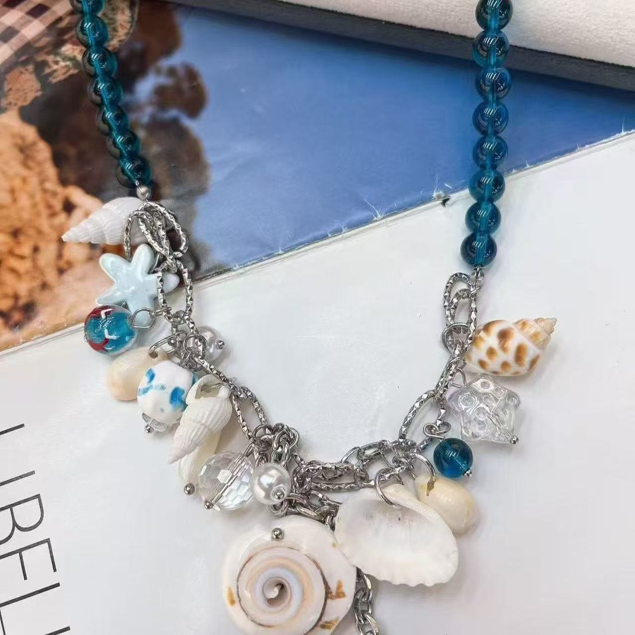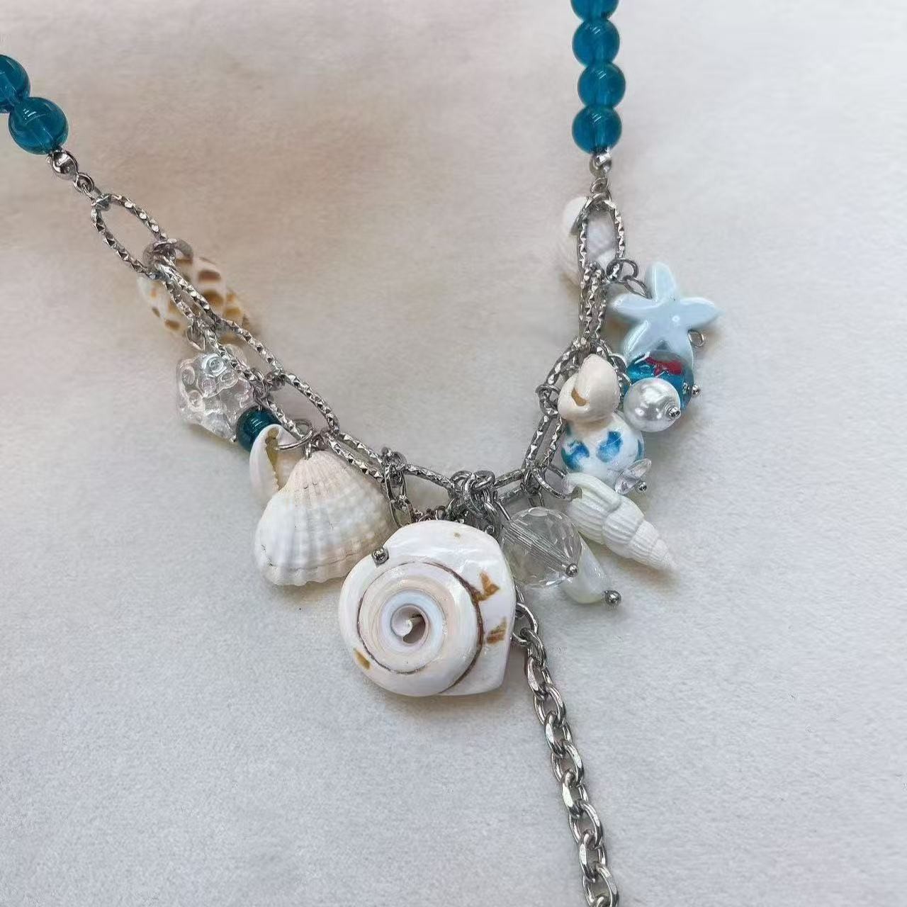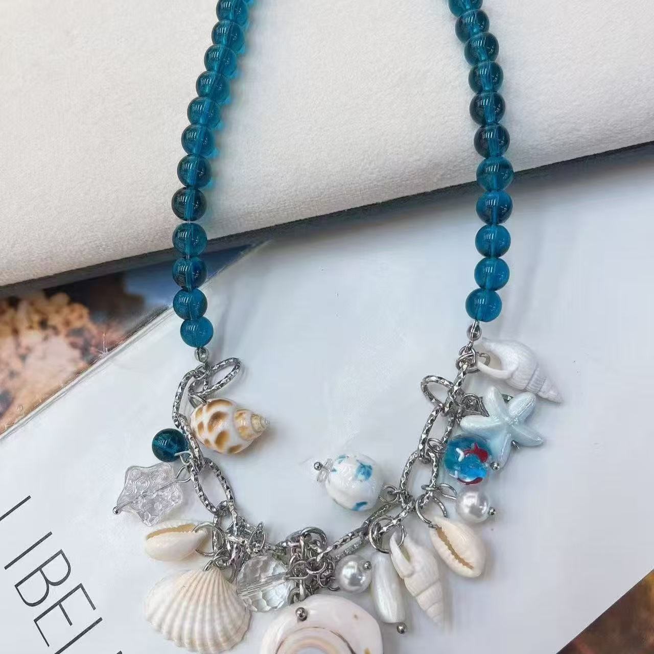 Handmade seaside vacation style shell starfish blue beaded necklace