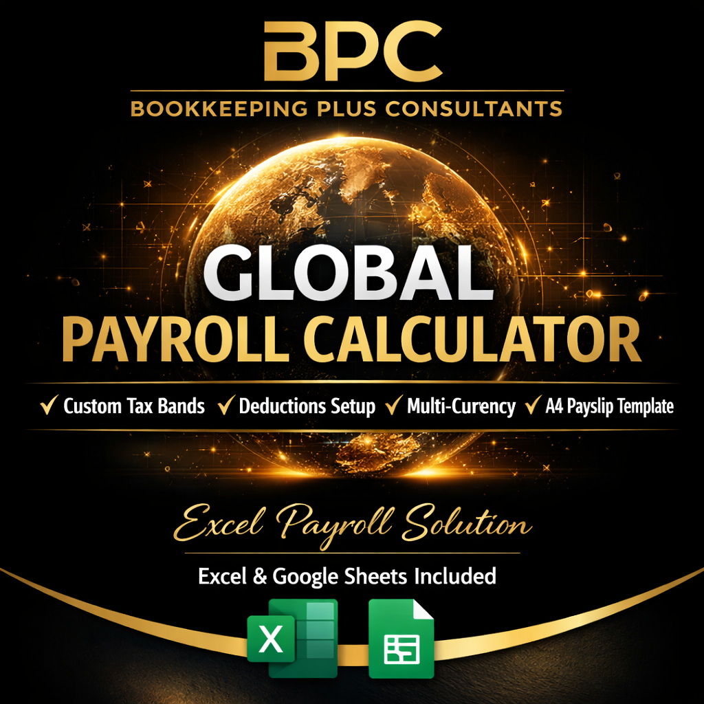 Bookkeeping Plus Consultants (BPC) Global Payroll Calculator is a professional, ready-to-use payroll spreadsheet designed for businesses, NGOs, schools, and accountants in any country.